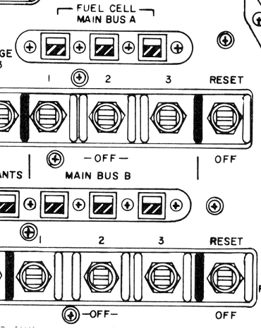 At the time of the launch, the spacecraft's power needs were supplied by the three fuel cells and the onboard batteries. The Command Module has three batteries, labeled A to C, with A and B being on line at the time of the launch. The total current spent was approximately 75 amperes at the time of the incident. The fuel cells supplied most of this, with the batteries each putting out about 4 amperes of current. When the fuel cells fell off the line, the total electric power needs had to be supported by the two batteries. Since the battery system was not designed to supply such a load, this caused the voltage to drop in the main direct current power buses from the nominal 28 volts to approximately 18-19 volts. Although this too was transient and lasted for mere milliseconds, the sudden drop in operational voltage caused UNDERVOLT indications to be tripped. With the DC power down, the inverters producing alternating current also experienced a low output situation which caused AC bus warnings as well. Since the AC-consuming systems were still operating, the power demand rose beyond what the underpowered AC system could supply and the OVERLOAD warning was given. It was this power loss that caused the majority of the issues experienced during the ascent, when the undervoltage condition not only lit up all the warnings, but also caused many pieces of equipment to briefly malfunction. Thankfully the two batteries on the line were able to supply the total power load for approximately two minutes, when the fuel cells were reconnected and assumed the majority responsiblity again. No damage or malfunctions were found from any of the power generating or distribution systems after the power loss. From then on it was merely a process of resetting the alarms and the various power feeds, to ensure that normal voltage and current was seen in all of them. The crew later speculated whether adding the third battery, Battery C, onto the line, could have helped them stabilize the situation faster, but this probably not the case. Battery C was designated to act as a backup and would have been connected to the power system if either of the two other batteries failed. In this, too, the crew performed their duties exceptionally.