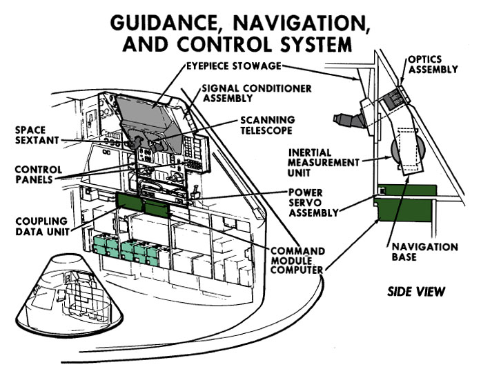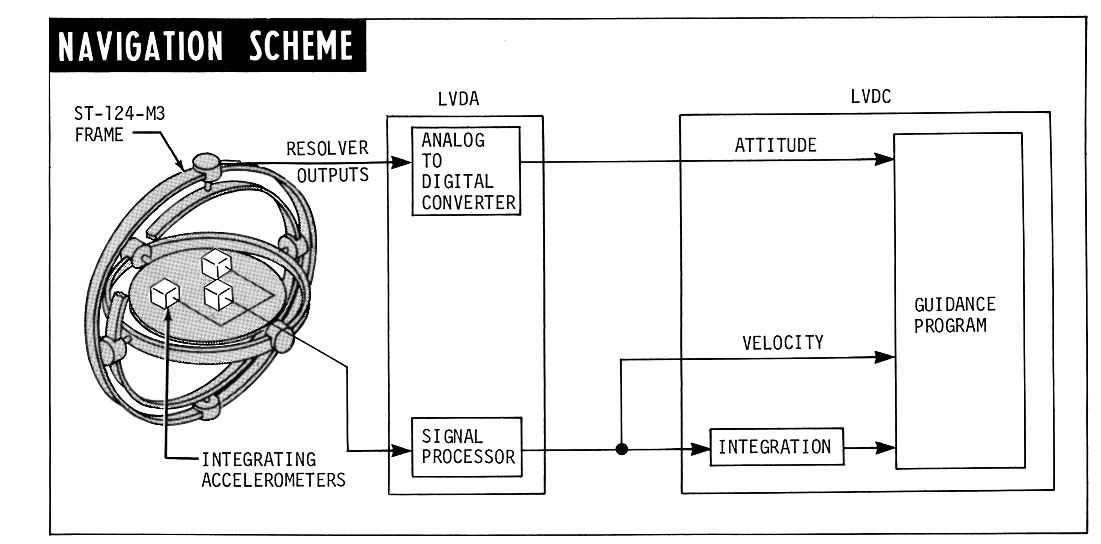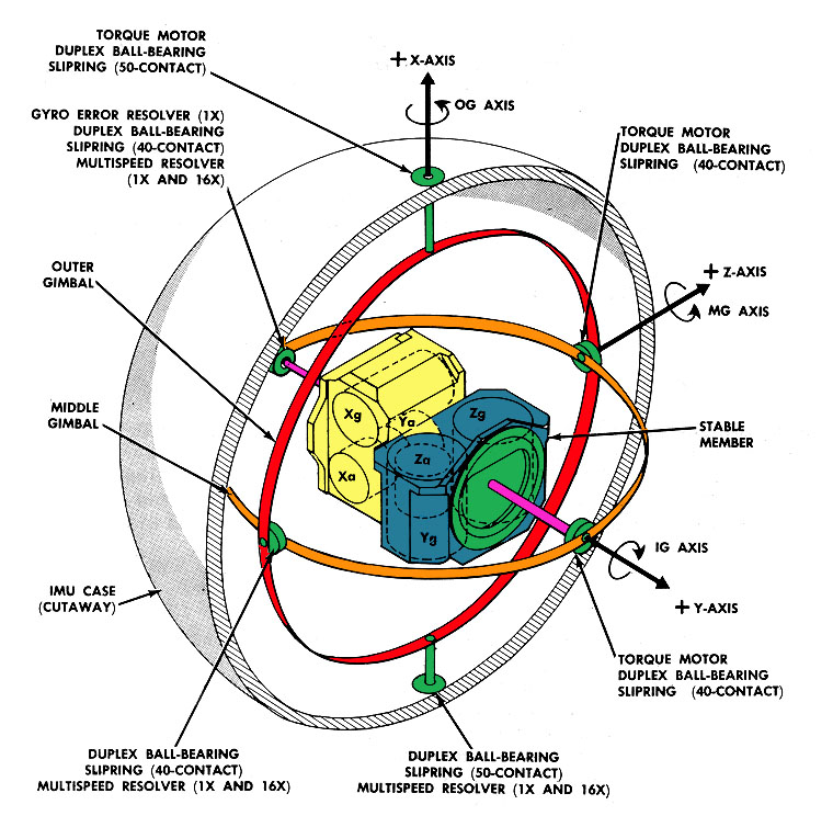 The heart of the guidance system was the Inertial Measurement Unit, or the IMU. It was also known as the platform. Accelerometers and gyroscopes places orthogonally (in 90-degree angles to one another) onto the stabilized platform detected changes in attitude and velocity on the three axes of motion. The platform rested on three gimbals nestled on one another so that whenever the spacecraft moved, it essentially rotated around the platform which stayed in one position, thanks to little electric engines that continuously maintained its orientation. Electronics known as resolvers installed onto the gimbals detected these movements and fed this information to the guidance system, where it was converted into information about any changes in their attitude.