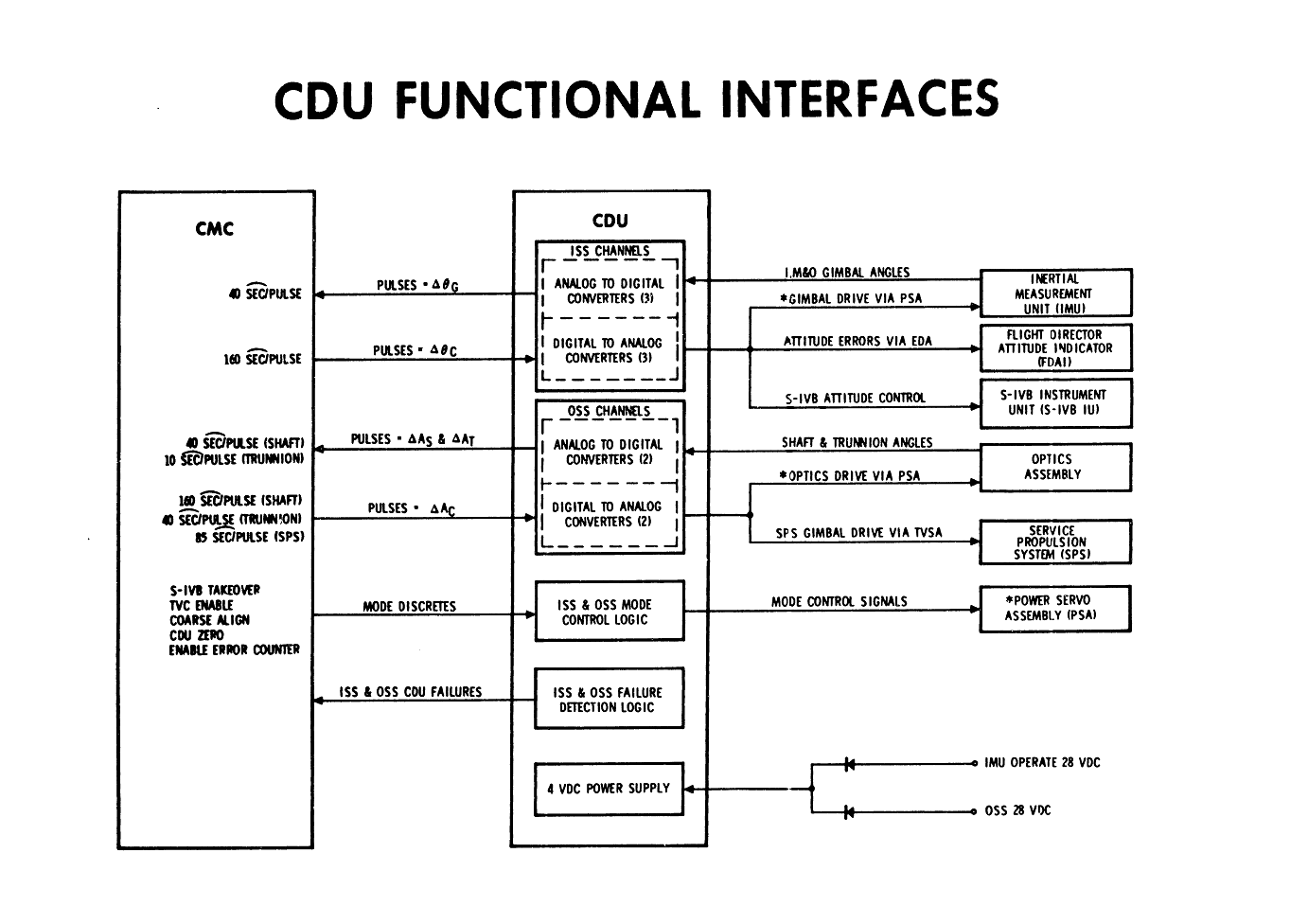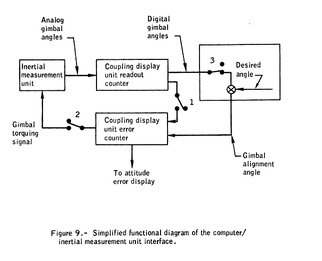Communicating between the CMC and the IMU was an electronics package known as the Inertial Coupling Data Unit. Its purpose was to convert the analog electronic signals to a digital form that the computer could interpret, and vice versa deliver the computer's orders to the IMU by reversing that process for digital to analog conversion. There were in fact a total of five Coupling Data Units in the system, three covering each of the roll, yaw and pitch axes respectively, plus two individual ones that communicated between the computer and the navigational optics. These Optical Coupling Data Units were another crucial piece of navigational equipment, but were not operating at the time of the lightning incident since the optics would only be needed once in orbit. It was the lightning's effect on the CDUs that caused the IMU platform to tumble.