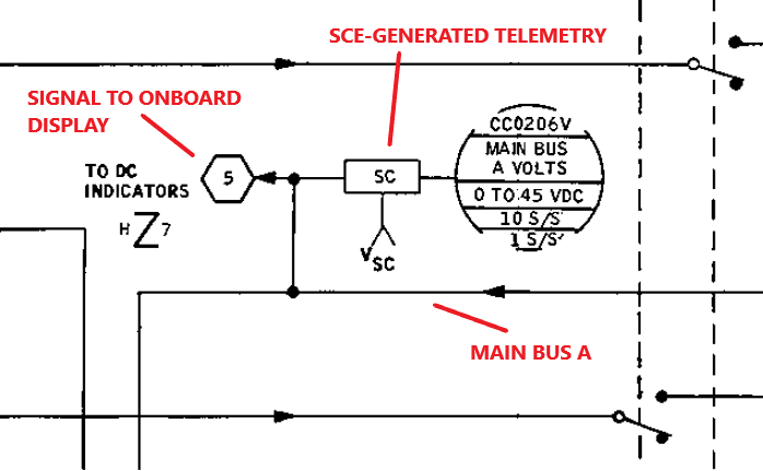 Signal flow for monitoring Main Bus A. Voltage for onboard display is derived directly. For telemetry, the SCE conditions the signal into a form that can be transmitted via the PCM.
