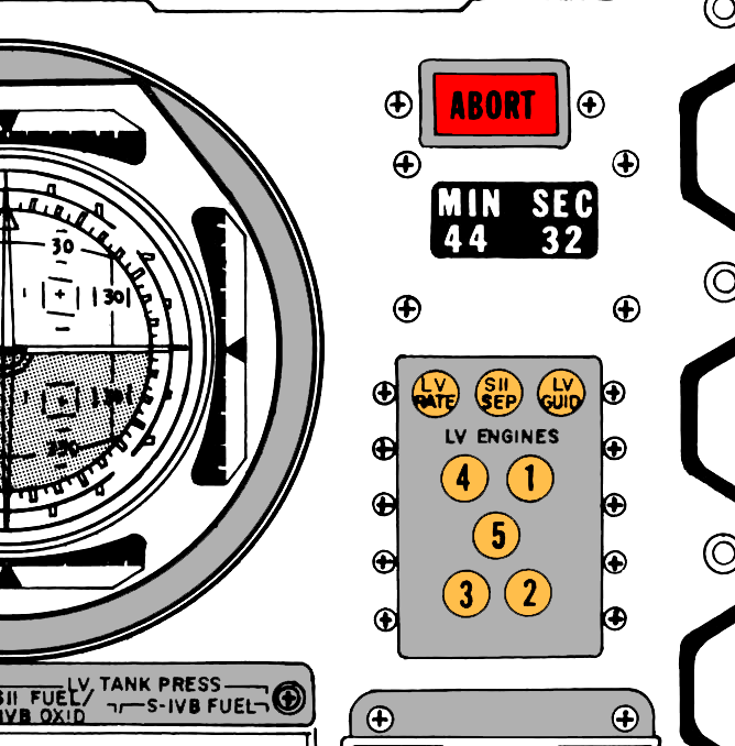 Abort light and launch vehicle engine and status lights on Panel 1. Reproduced from Apollo 13 Saturn V Flight Manual. Colored for AFJ.