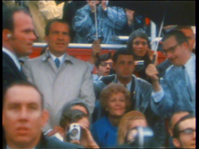 President of the United States Richard Nixon and the First Lady Pat Nixon wait for the launch in the rain. Despite long persistent rumors that the launch carried on in dangerous weather so as to please the President, no evidence suggests that this was the case.