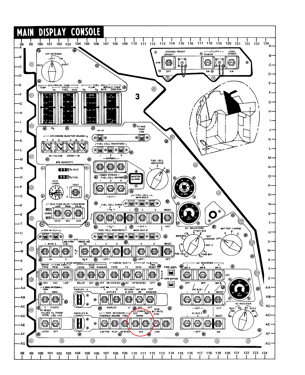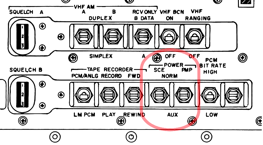 At the bottom of Panel 3, in front of Lunar Module Pilot Alan Bean, there were controls for the spacecraft telecommunications system. One of these controls was the three-position switch for the Signal Conditioning Equipment, SCE. It had been flicked upwards to the NORMAL position during launch preparations and would usually remain in this position throughout the mission. This switch position would have the SCE electronics use its primary power source. Yet, according to John Aaron, the problem appeared to be in this particular part of the system, and Aaron had figured out that the way to fix the problem was to select the secondary power source within the unit. Alan Bean's spacesuit gloved finger performed this emergency procedure, which resulted in the onboard instrumentation finally receiving normal power again. Within moments, clear data began to filter in onto the screens in Mission Control.