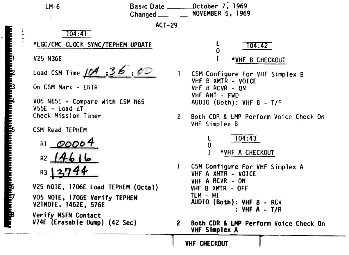 - ACT-29 - LGC/CMC Clock Sync/Tephem Update, VHF B Checkout/VHF A Checkout