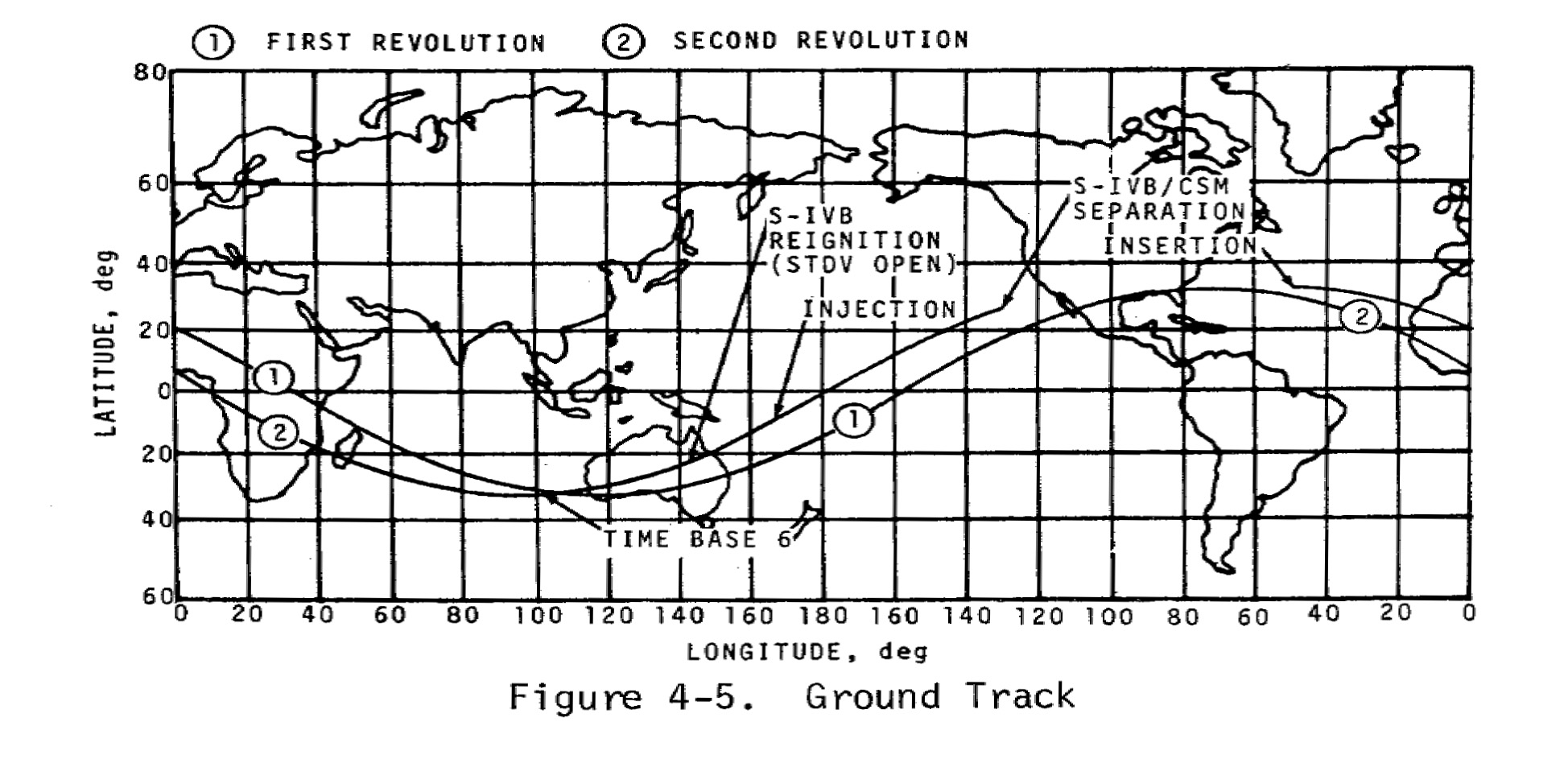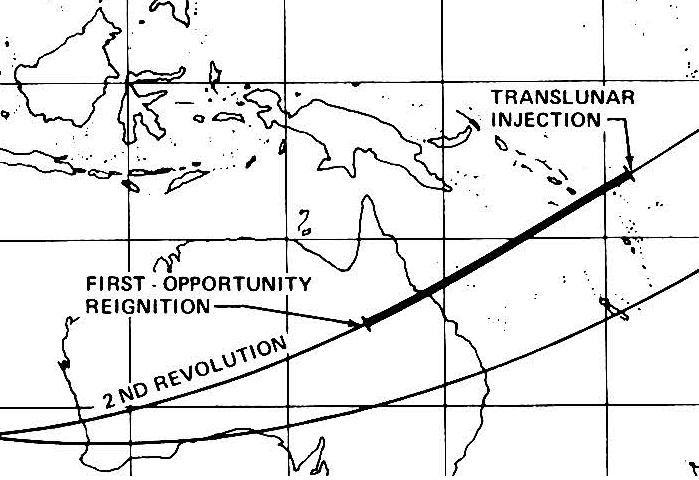 This is Apollo Control. We've had Loss Of Signal now with the spacecraft at the Canary Island Tracking Station; we won't reacquire again until the spacecraft reaches the tracking station at Carnarvon, Australia. That will be at a Ground Elapsed Time of 52 minutes, 36 seconds. Recapping at the time we lost contact with the spacecraft through Canary Islands, we looked to be in very good shape for the Translunar Injection burn, with the Saturn third stage. The second stage center engine shut down about 2 minutes early; the total overburn time on the third stage was about 10 seconds. We don't expect that this would have any effect on the Translunar Injection. At 25 minutes, 20 seconds; this is Mission Control, Houston.