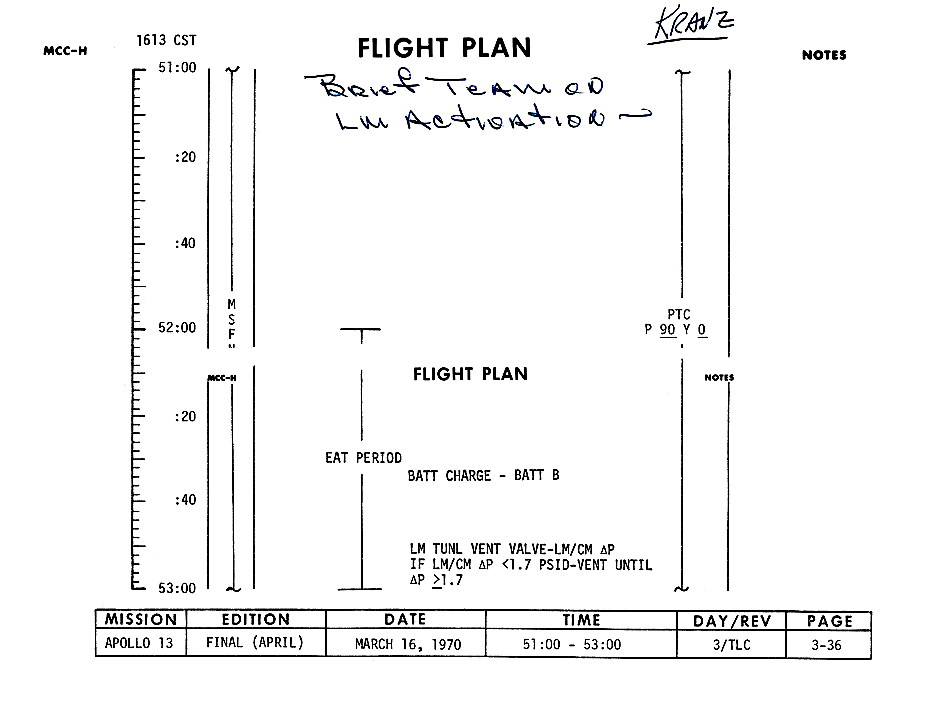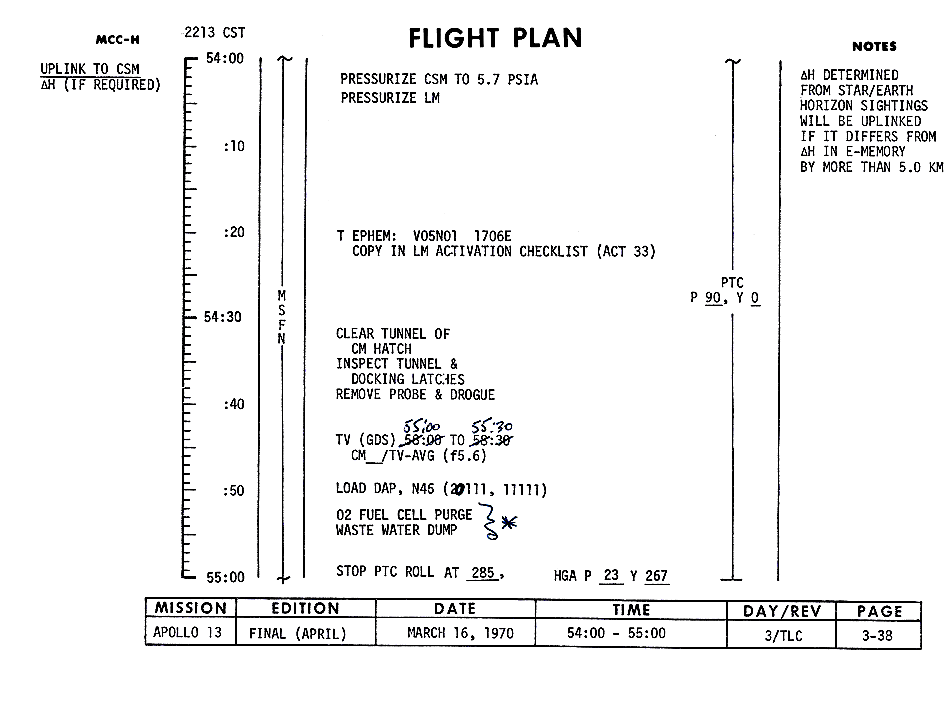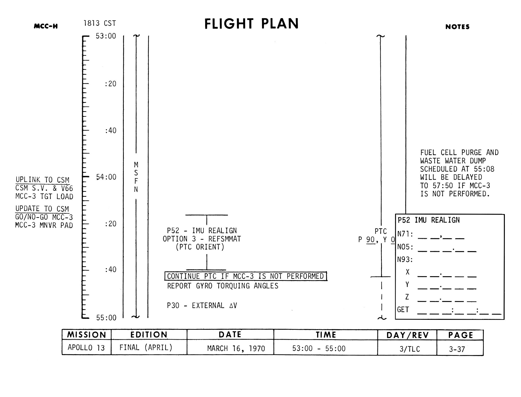 047:45:48 Kerwin: Okay. I've got some details on the Flight Plan for you as follows. Of course, since there's no MCC-3, you'll be deleting all the midcourse 3 stuff including the - the P52, which is called out at about 54½, and we'll be slipping that until later, which I'll - which I'll - which I'll tell - which I'll tell you in a minute. Okay. Then you - we want to move the battery charge up three hours to about 52:30. And we want to move the - moving the LM tunnel vent valve to LM/CM Delta-P up three hours to 52:45, and at that point you can simply go to the 57-hour point in the Flight Plan and change the number from 57 hours to 54 hours and start through that. In the remarks section at about 57:50 it says, 'O2 fuel cell purge and waste water dump,' here. If not performed earlier, we want you to do that at 54 hours and 50 minutes. The TV pass then, will be at 55 hours to 55:30. You'll go right through the LM Activation checklist stuff. I'm losing you; let's wait a minute. [Long pause.]