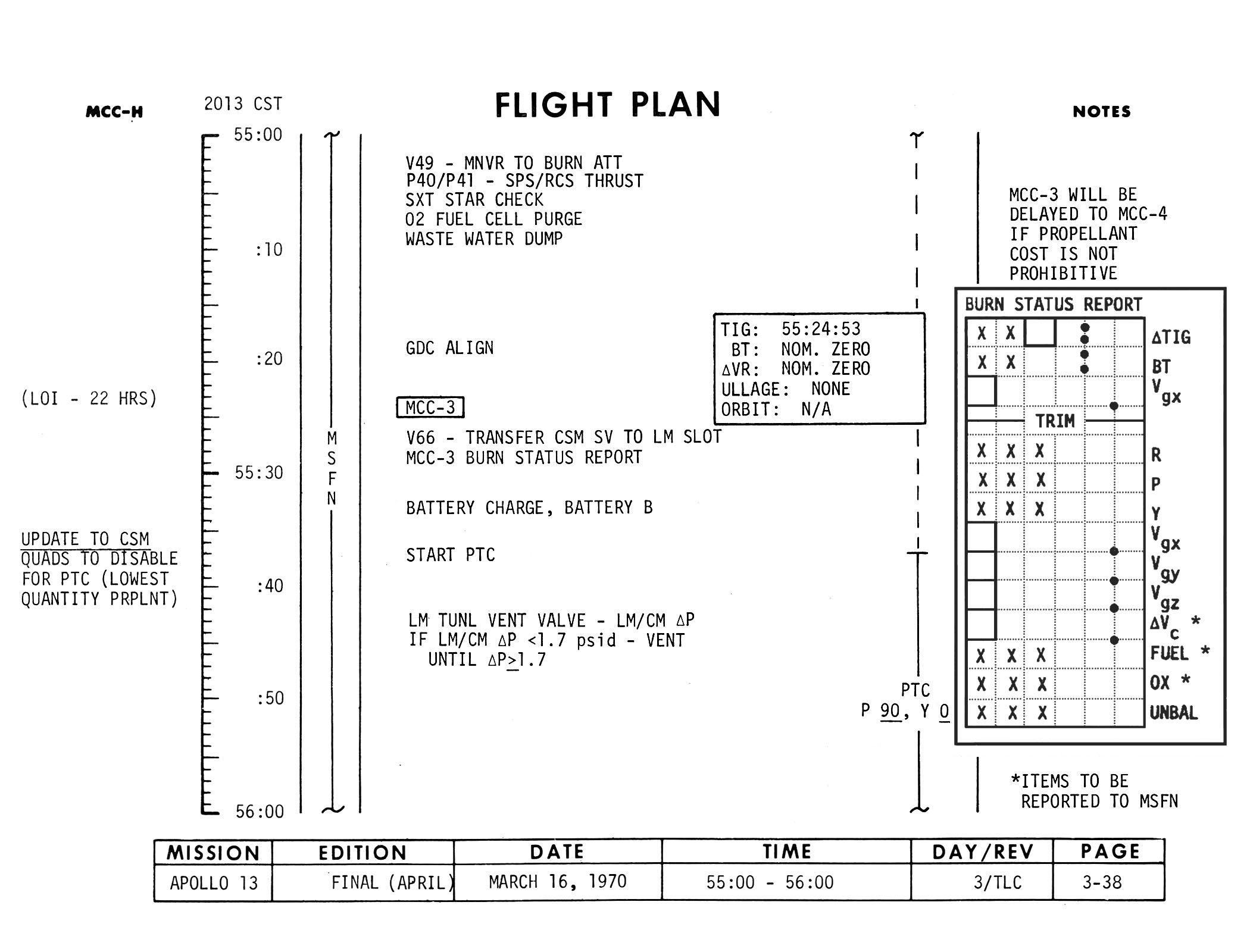 047:51:09 Lovell: We're deleting midcourse-3 and we've moved up LM entry to 55 hours. So we'll merely follow all the - We'll follow all the procedure that leads up to LM entry that was originally scheduled for 58.