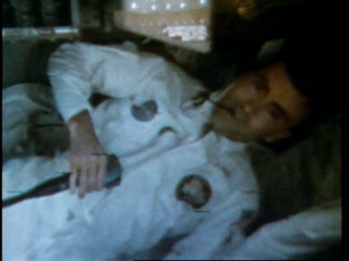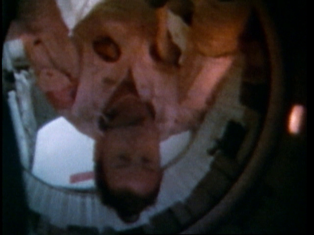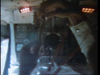 055:38:56 Lovell: Okay, Houston. For the benefit of the television viewers, we've just about completed our little inspection of Aquarius, and now we're proceeding through the hatchy-gap into the tunnel and going back toward the Odyssey. [Pause.]