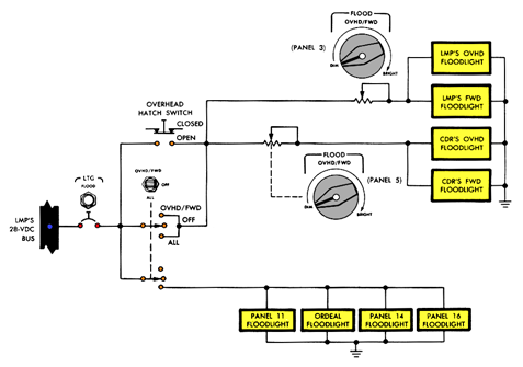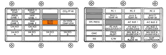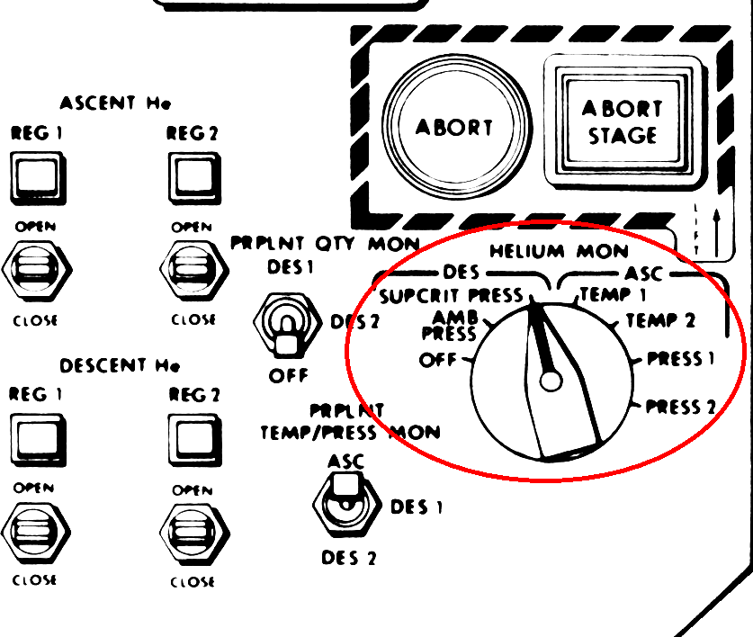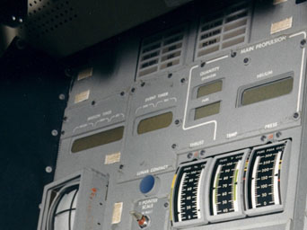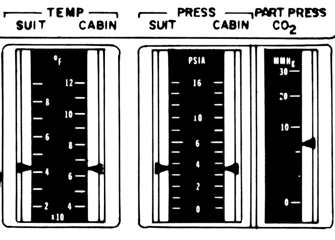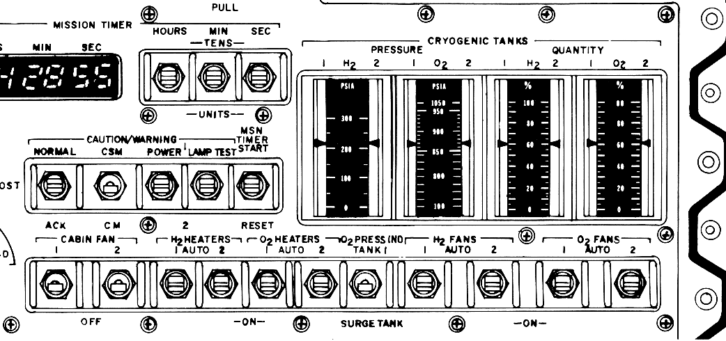Cryogenic tank pressure and quantity gauges as well as the switches for controlling the fans and heaters in Auto and manual modes. Original scan via heroicrelics.org