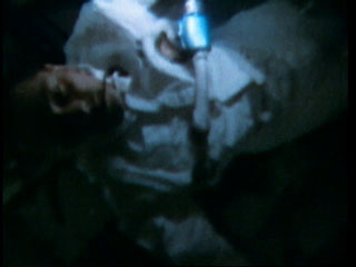 055:37:34 Lovell: And now while Fred's taking his hammock down and restowing it, I might give you some idea of what sort of confusion of attitudes since there is no up or down, and I'm situated on top of the ascent engine just at the entrance to the tunnel. I'll reverse the camera 180 degrees and go from Fred, look through the tunnel again back at Odyssey, and we might pick up part of Jack. [Long pause.]
