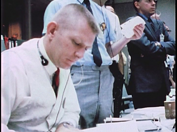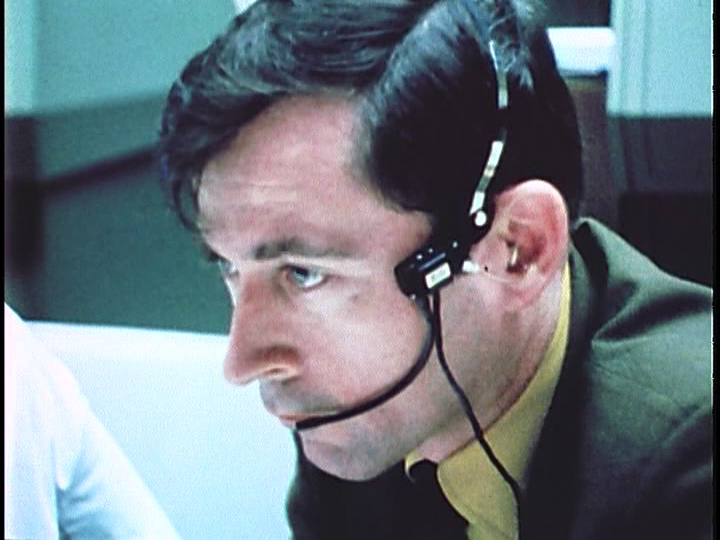 The controllers are watching the TV show, with Fred on the big screen. The back of Flight Director Gene Kranz is well identifable around the center. To his left, Jack Lousma and Vance Brand watch from the CapCom station.
