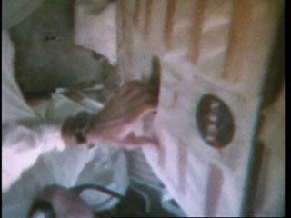 Fred is lodged sideways across the cabin to show off his sleep station. In the TV capture, he has his finger on the Push to Talk button on his comm carrier to speak to Mission Control. Just above his right elbow is the cover of the Lunar Module DSKY, with a cheat sheet of computer Verb and Noun commands!
