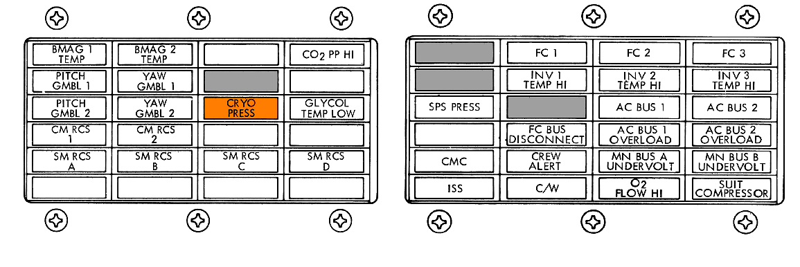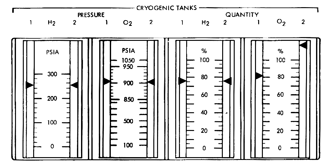 Cryo pressure and quantity measurements, as seen onboard at this time. Recreated based on transcript.