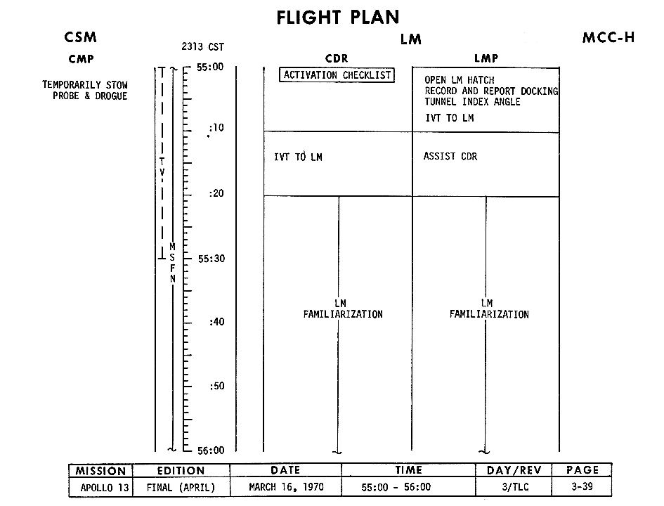 047:50:54 Lovell: And then about 52:40 we're going to do the LM tunnel vent valve, LM/CM Delta-P which has been written up at 55:40.