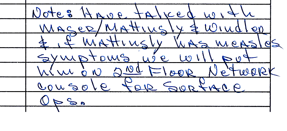 This is Apollo Control at 38 hours, 8 minutes. The crew is now about one hour into their scheduled ten-hour rest period and here in Mission Control the activity has settled down primarily to watching the spacecraft systems. At the present time Apollo 13 is 140,357 nautical miles [259,941 kilometres] from the Earth travelling at a speed of 4,135 feet per second [1,260 metres per second]. At 38 hours, 8 minutes; this is Mission Control, Houston.
