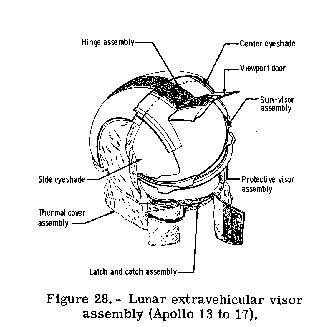 The LEVA slips over the space helmet and provides additional thermal insulation, micrometeoroid protection, as well as a variety of sun visors and shades to protect against the unfiltered sunlight.