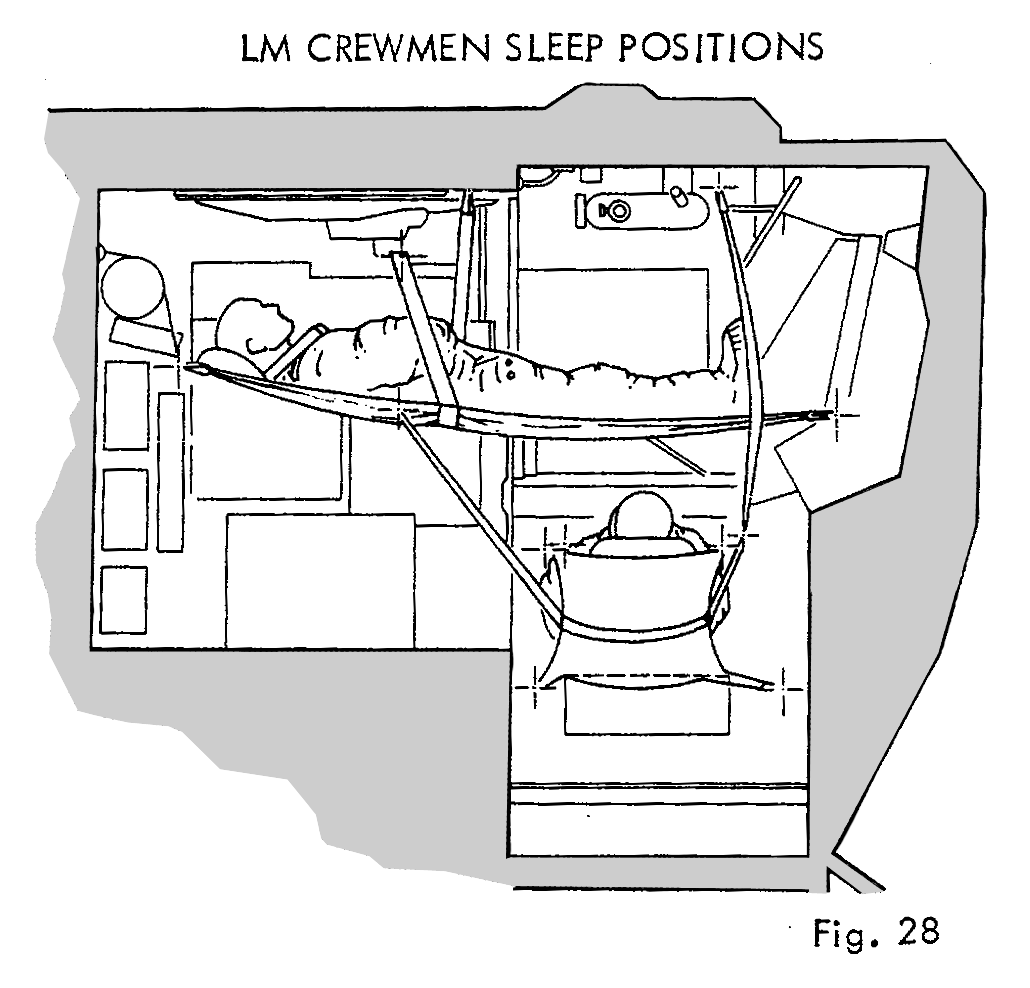 055:36:57 Haise: And for the benefit of those that may wonder where Jim sleeps. Be a little difficult to rig his hammock in here right now with the hatch open, but his runs laterally in this direction, fore-aft. So he has the upper berth and I get the lower berth. [Long pause.]