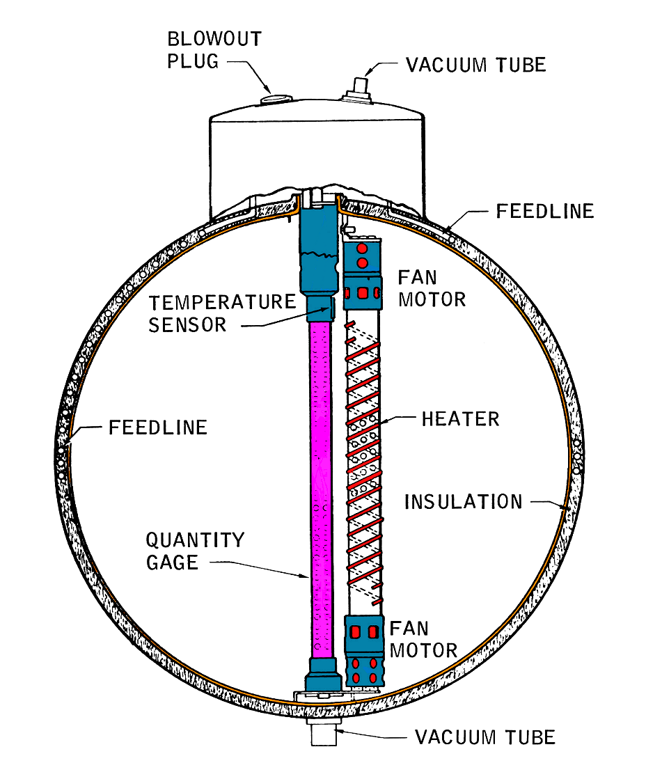 The quantity gauge consists of two aluminum tubes, one inside the other, within the O2 tank. These act as a capacitor where a static electric charge is set up between them through the liquid oxygen inside the tank. The density of the oxygen between them affects the capacitance of the tubes; i.e. their ability to store an electric charge. This capacitance can be used to measure the amount of cryogenic oxygen inside the tank. For reasons unknown, this system has suddenly stopped producing meaningful information.