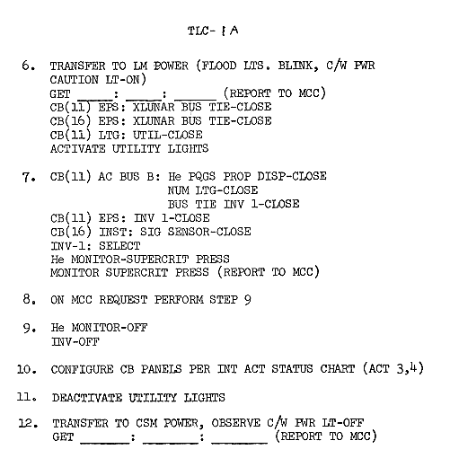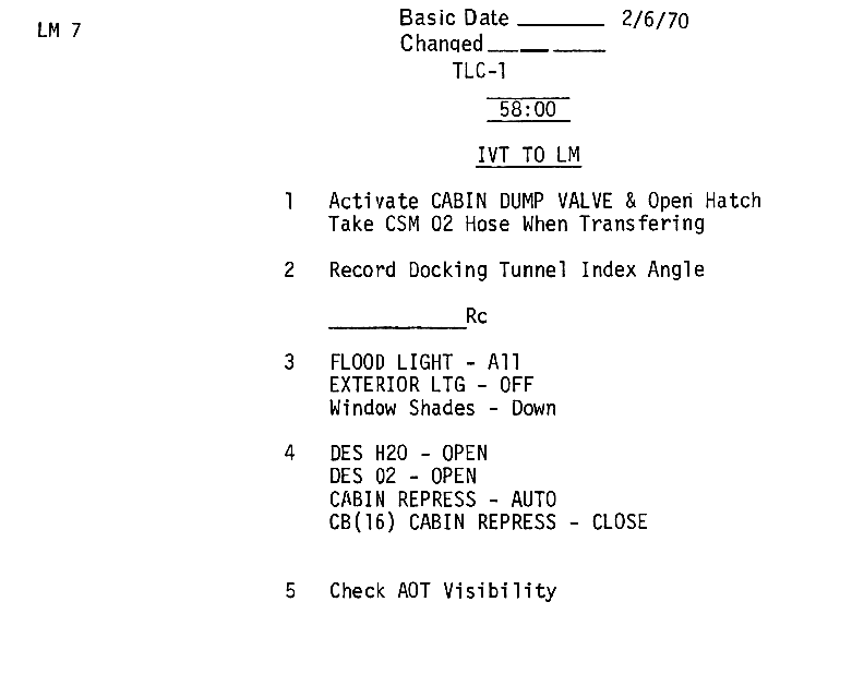 The original plan was to check out the LM at the end of the day, but the deletion of the potential midcourse correction has cleared up the timetable, aiding the desire to check out the cranky supercritical helium tank.
