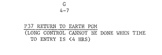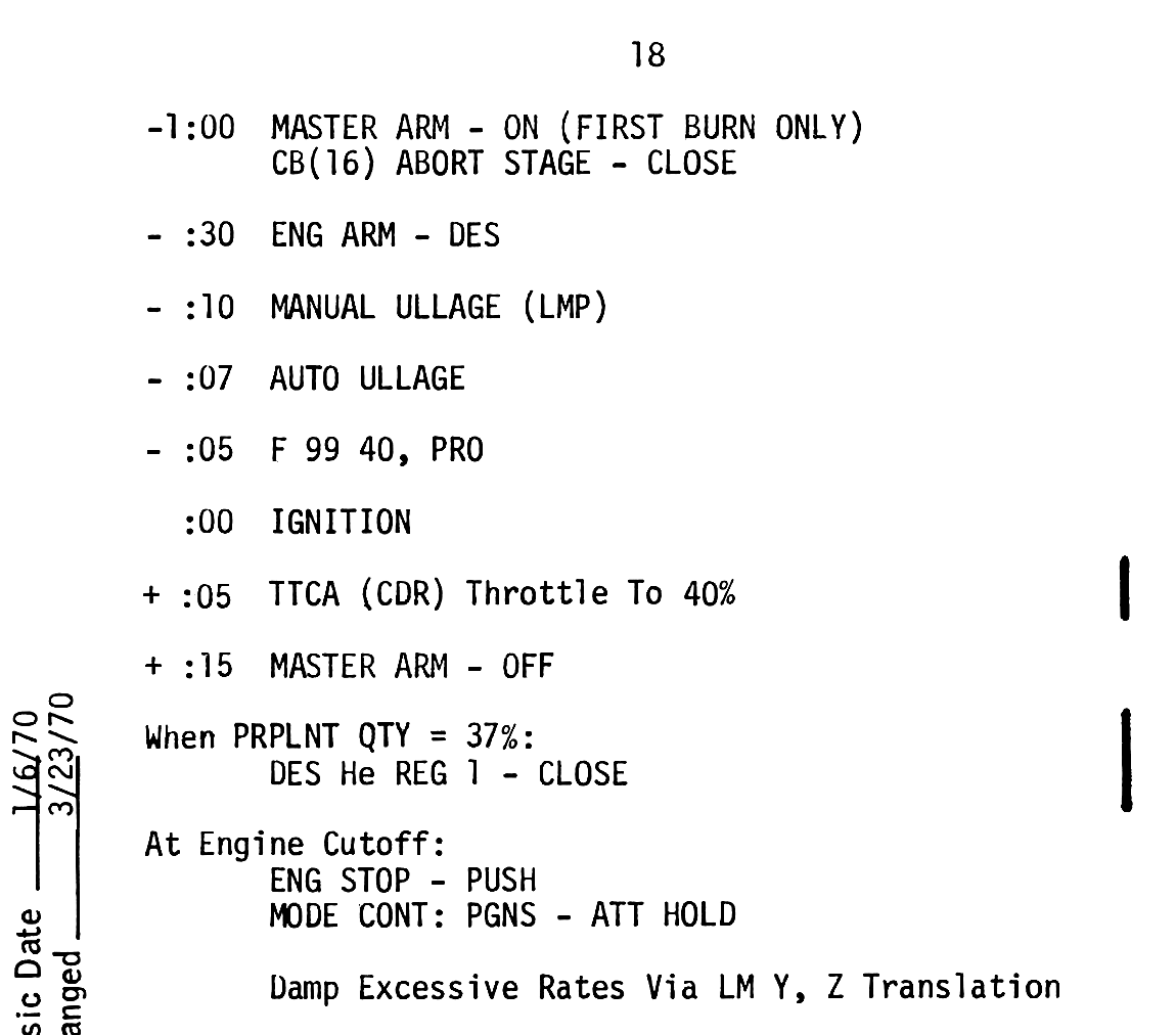 077:53:28 Brand: Okay. About half-way down. When propellant quantity equals 30 percent, or rather 37 percent, we would like to change that line to read - when time to go is equal to 10 seconds - Of course, the line under that remains the same then, Descent He Reg 1 to Close. [Pause.]