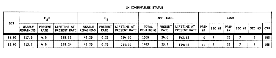 077:59:23 Haise: Okay. I got the Power Amps now. PC plus 2 hours, 079:27:38.30; plus 0833.0, minus 0050.9, minus 0213.9; N/A, plus 0020.5; 0861.5, 4:24; 272, 081; rest N/A. Ullage, two jets, 10 seconds; CSM weight, 62480; LM weight, 33452; DPS throttle profile the same, 5 seconds idle, 40 percent at 21 seconds. Remainder at Max.