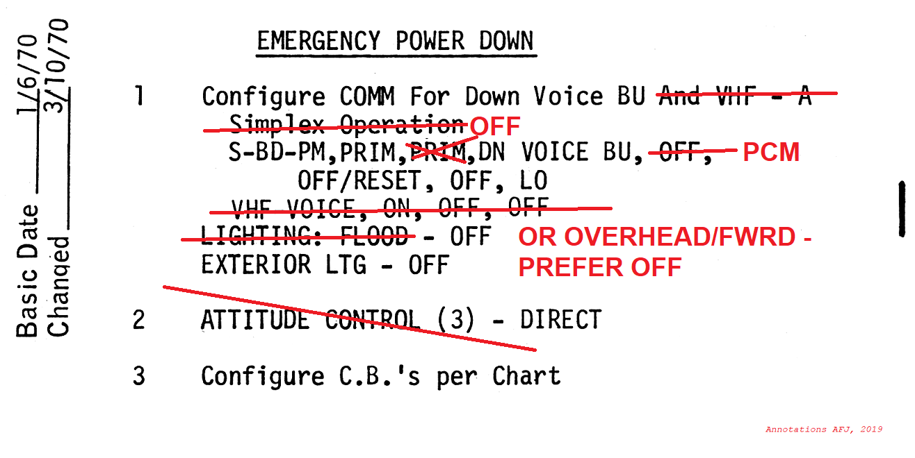082:07:05 Lousma: That's affirmative, Jim. All other breakers in that row are as you see them in the checklist. And on row 5, the only change is that we want you to, under EPS, open Ascent ECA Control. Over. [Pause.]