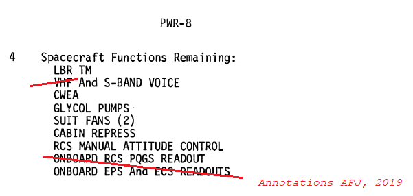 082:15:18 Lousma: Okay, and if you turn over the page on Power 8, we have the spacecraft functions remaining to you. We've got low bit rate TM. However, we don't have any VHF. We have CWEA. We have Glycol Pumps. We have Suit Fans. We have Cabin Repress for you, and stand by in Attitude Control here. Okay, in Attitude Control, we'll have hardovers for uses in emergency, and for normal usage we want to have a 15-minute delay to get the heaters on to warm them up before use. How do you read?