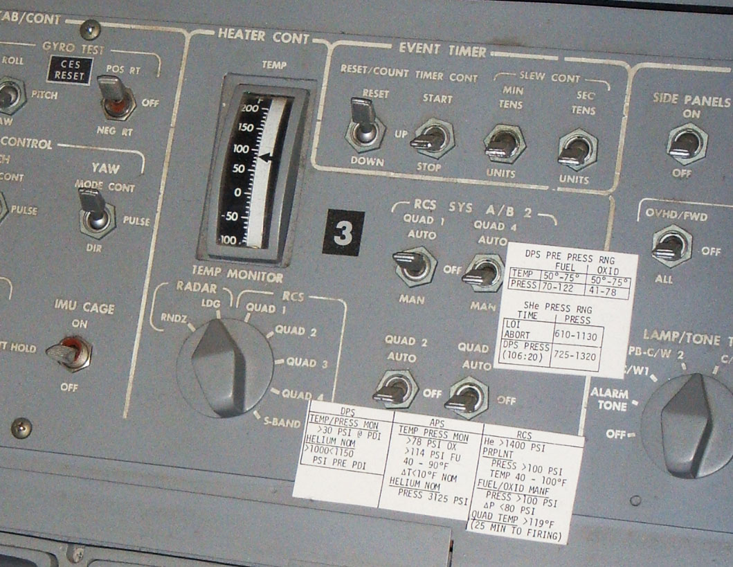 Panel 3 RCS heater switches as seen in a LM simulator. They plan to control the RCS temperature manually as required. Image courtesy of Frank O'Brien.