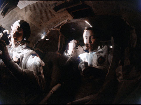 Jack Swigert and Jim Lovell eating in the LM. 16mm film capture. NASA