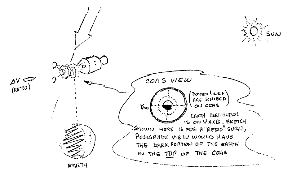 087:27:10 Lovell: That's right, Jack. What I'm going to do is - We'll stop with the Earth in the commander's window, the COAS down, and then I'm going to maneuver the spacecraft so that I have the lighted portion of the Earth at the top of the window; that is, the COAS will be along the plus-Y of the spacecraft and the top of the window - of the rendezvous window, I should be looking into the Sun. That means I'll be burning towards the Sun and steepening the angle. [Pause.]