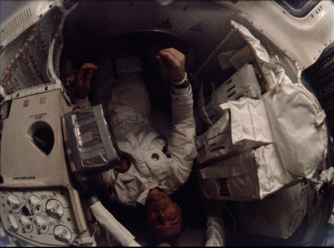 Jack Swigert seen floating 'down' the docking tunnel and into the LM. Onboard 16 mm film. JSC.