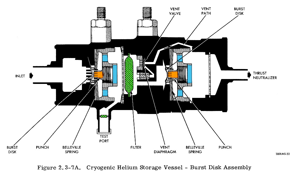 The burst disk, one of the most talked about components of the LM during the mission. There are actually two of them inside the device, each set to be burst by a spring-loaded punch when the pressure rises to its set level.