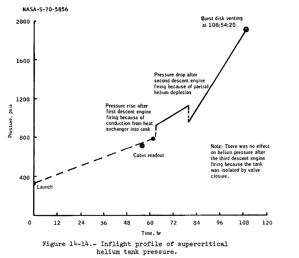 This is Apollo Control at 107 hours, 31 minutes. We're presently reading a pressure on the supercritical helium tank of 1,897 pounds per square inch. Our LM Control officer just advised the Flight Director that he expects the most likely time for the burst disk on the supercritical helium tank to rupture would be within the next 15 minutes or so. At that time our indication in Mission Control that the disk has ruptured would be a drop in the tank pressure to zero. We presently show a current on the spacecraft Electrical Power System of anywhere from 10 to 12 amps. This is well below the minimum that we'd like to stay under. We'd like to keep it down to at least 14 amps and since the spacecraft is then powered down, we've been well below that figure.