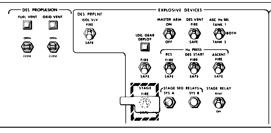 Explosive Devices switches, including the fuel and oxidizer vents, on Panel 8 in the LM. Original scan courtesies of heroicrelics.org.