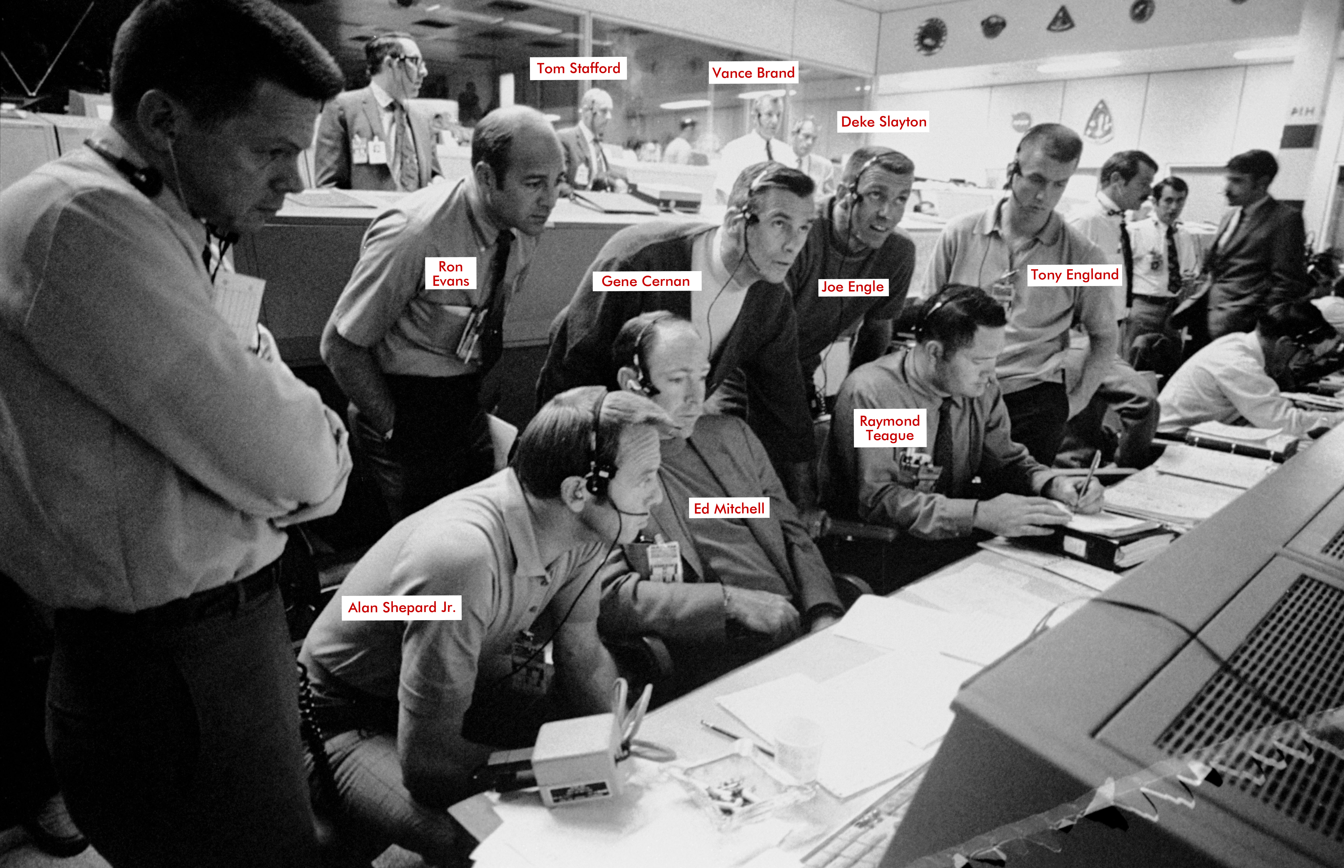 Astronauts monitoring the mission. Although taken earlier, it shows most of the same crowd that had gathered for the moment as well.