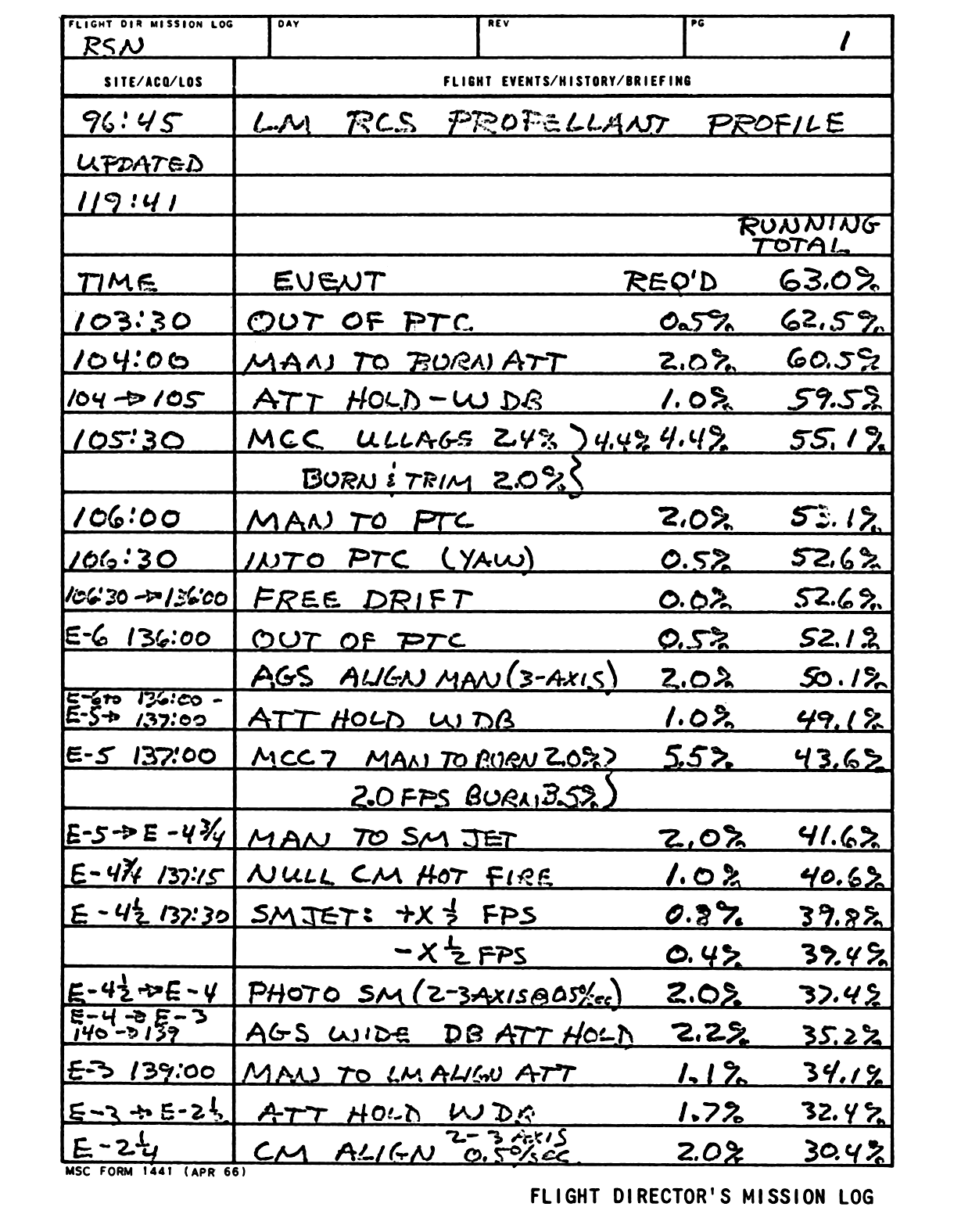 137:27:54 Kerwin: Just for your information, we see 3.0 in register 1. We read you up 3.1 on the PAD. The actual Delta-V was 3.05, and they warned me that it might come out 3.0.