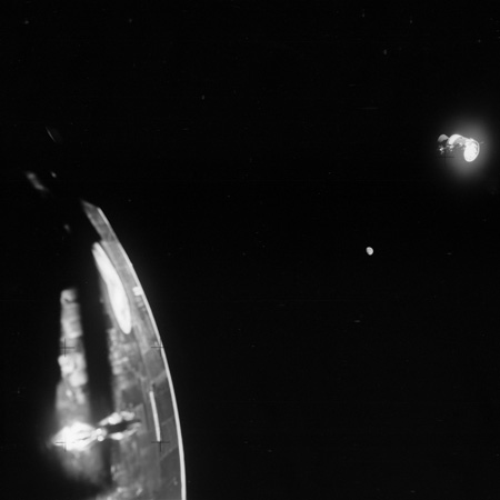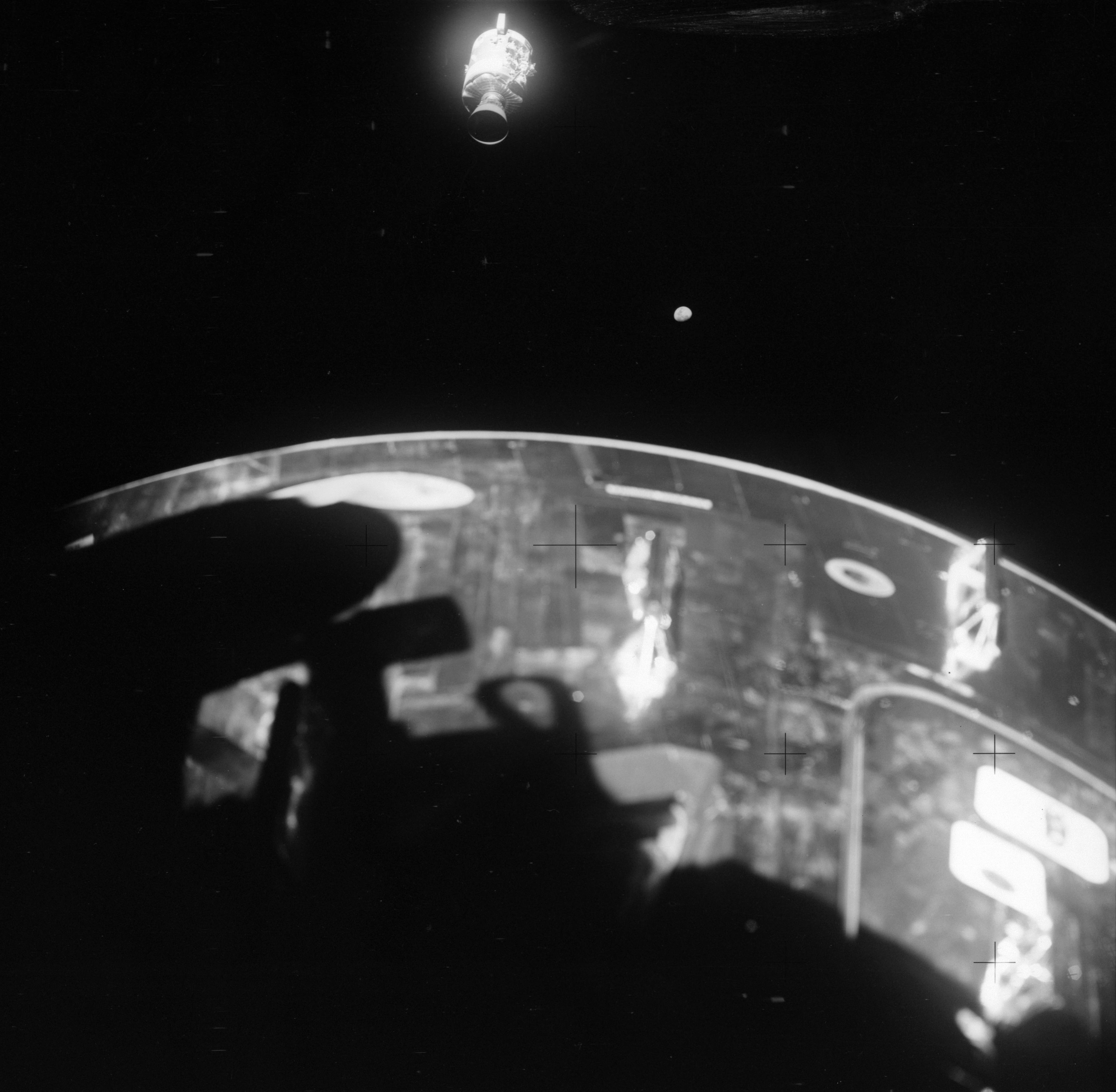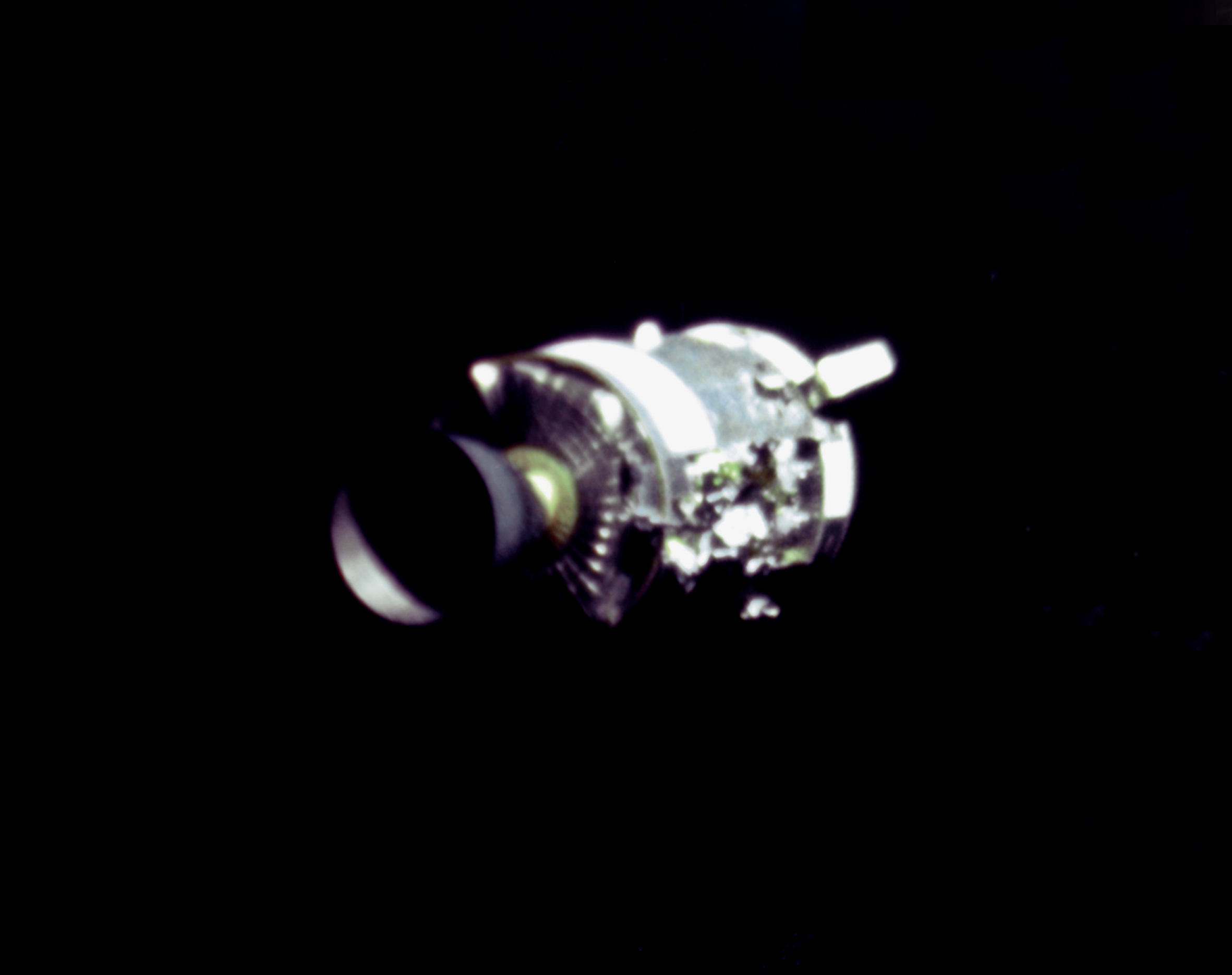 The skin of the Command Module and the Service Module shine in sunlight, betraying the fogged-up windows of the LM. The now distant Moon is also seen as a bright spot.