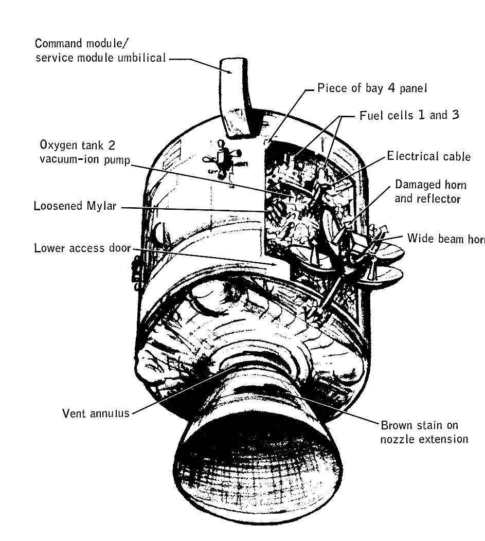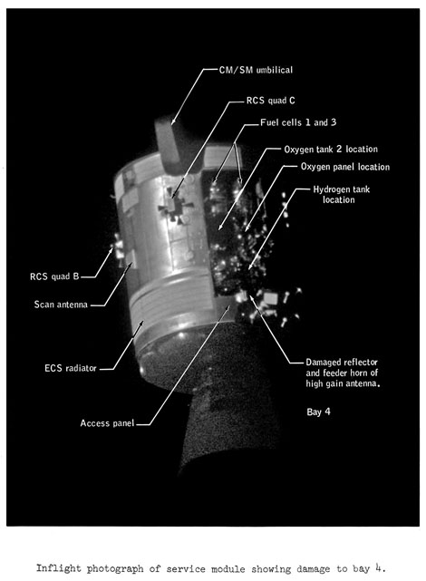 While the crew was only able to take a glimpse and describe what they saw, the photographs they took were used to analyse the total extent of the damage. The place of the O2 Tank 2 is empty. Damage is visible to the High Gain Antenna and the SPS engine nozzle as well.