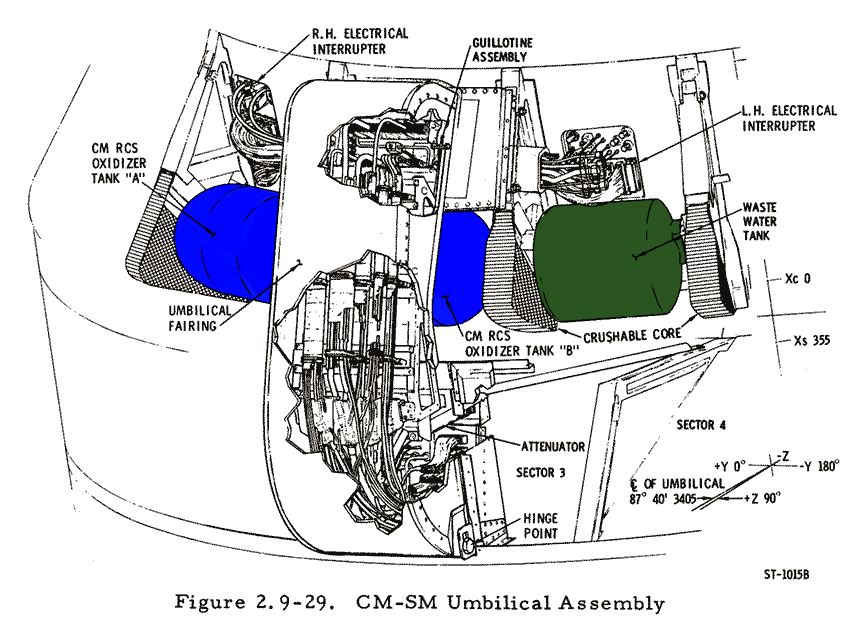 The damage inside sector 4 is evident. The hull panel is almost entirely gone, and although the fuel cells can be seen on their installed positions, the section with the cryogenics tanks and their support equipment is a jumble of jagged metal and broken insulation.