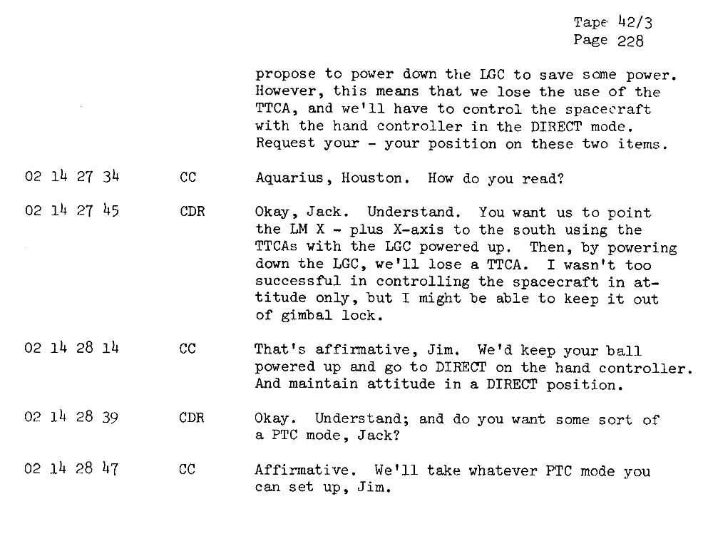transcription of the original air to ground communications that took place during the mission of Apollo 13. The Air to Ground loop consisted of the communications between the Apollo spacecraft and Mission Control in Houston. Additionally, we have included a transcription of the Public Announcements Officer commentary made during the mission, which has been sourced from other documentation. Digital copies of the original recordings available at