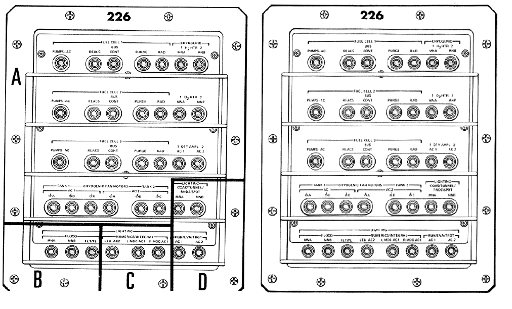 Images extracted from reference documentation such as the Apollo Operations Handbook (as above) were presented with the aim of maximizing clarity and educational value. Editing was done to remove any residual effects from image scanning process, and highlighting color was added for easier readibility and legibility. The original black and white materials are freely available online for anyone who wishes to browse them. For AFJ, we felt that the manipulation of secondary material such as these diagrams was something that improved their legibility and adds to the Journal as an educational resource. This extra ability to visualize the material is, we hope, of help to people wishing to learn more about these complex, fantastic machines.