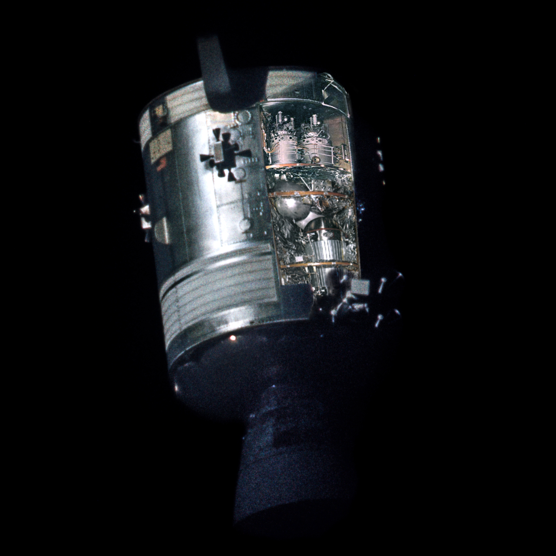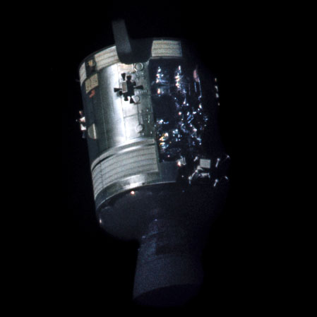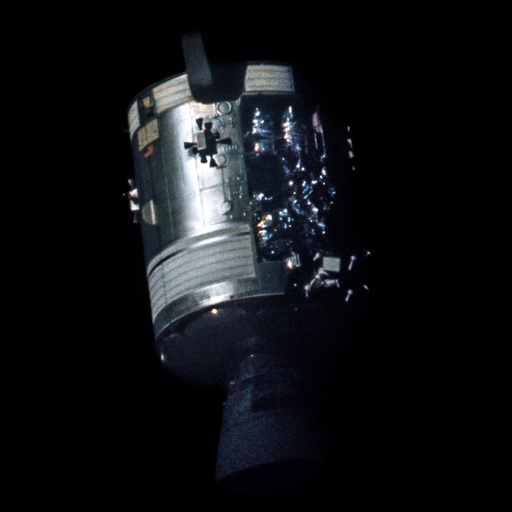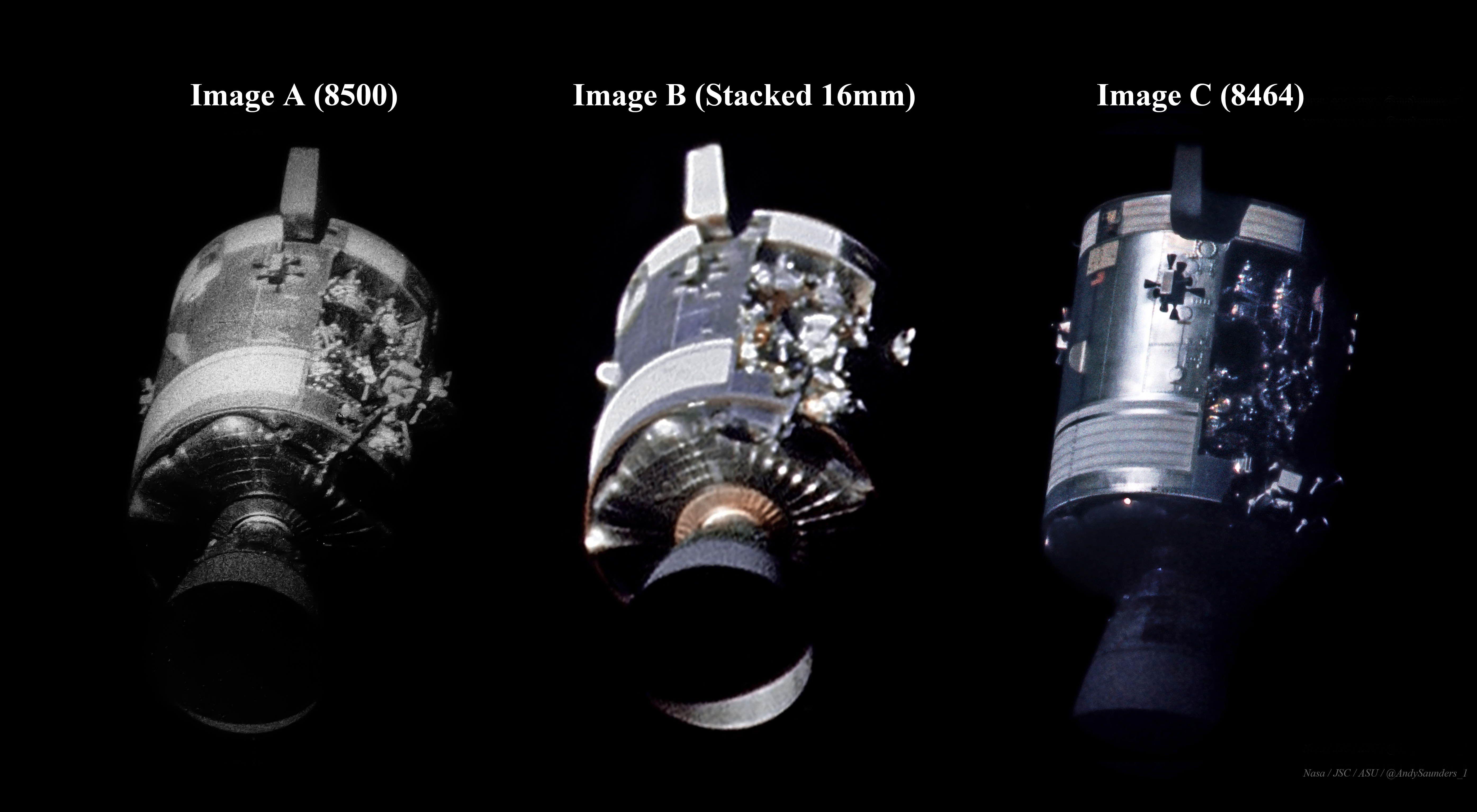 Figure 1. These three images of the jettisoned SM have been derived from the Apollo material above. Image reprocessing: Andy Saunders (Click for the full size version.)