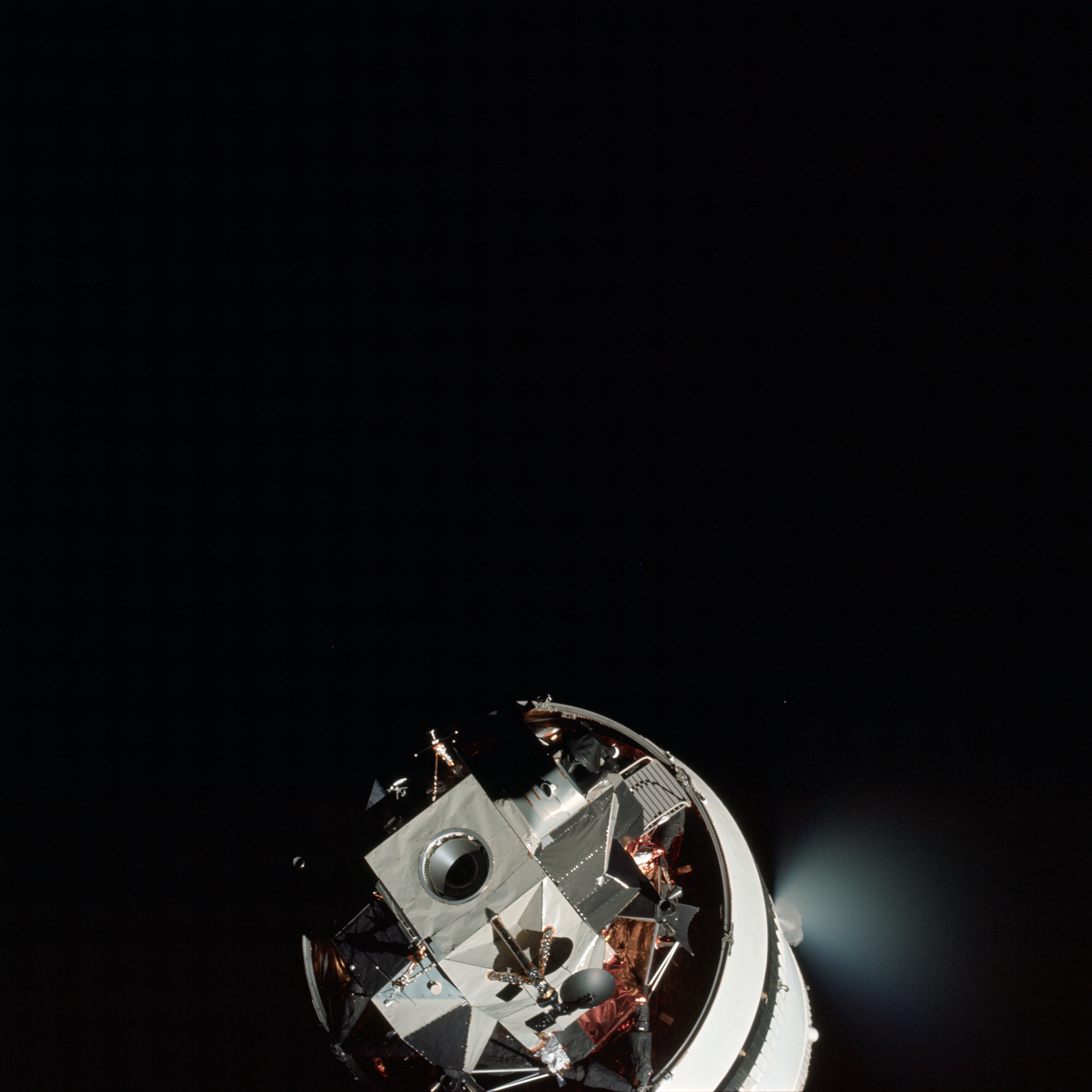 005:53:33 Roosa: Okay, Gordon. It's just now coming out from behind the LM for me in the - in the left window here. About another 15, 20 seconds, we ought to have a good view of it.