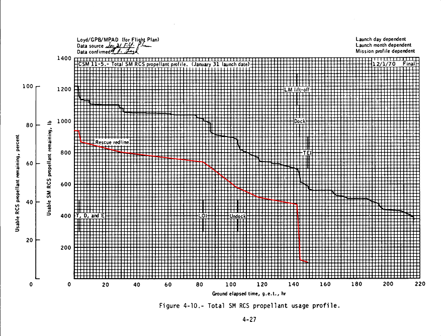 A diagram of estimated RCS propellant usage for each phase of the mission, as included in their Flight Plan. The 'rescue redline' highlighted is the minimum amount of fuel required to remain during each part of the mission so that the CSM could effect a LM rescue maneuver should the Ascent Stage become stranded on a lower than expected lunar orbit after lift-off.