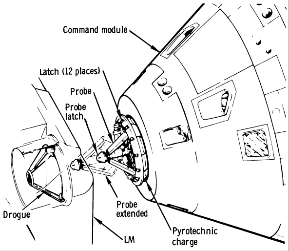 The Go for pyro arm indicates the crew is preparing for LM separation. We'll continue to attempt to recap. Returning to live conversation in the event the crew or the CapCom speaks up. The normal docking procedure would be for the probe mechanism to engage the drogue in the Lunar Module. There are 3 small latches in the tip of the probe which extend after passing through a hole in the end of the conical drogue mechanism. This is soft docking. At this time, a pneumatic system actuated by nitrogen pressurization draws the two vehicles together pulling the - retracting the drogue or rather retracting the probe, pulling the docking mechanism together and hard docking.
