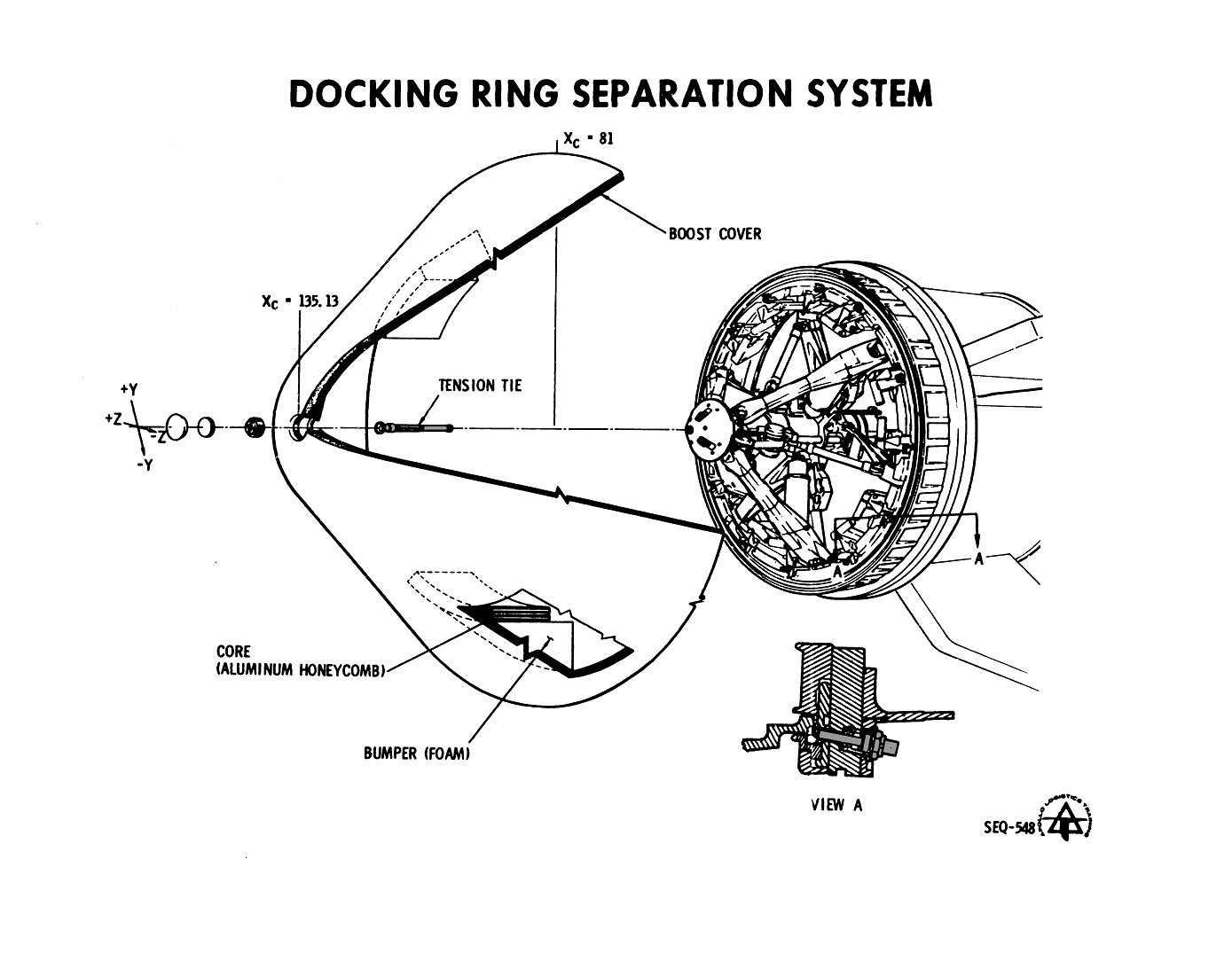 Separation of the CSM from the SLA is a fast but complex event. A train of linear explosives sever electrical connections between the Service Module and the S-IVB; they cut the metal structure joining the SM to the SLA to allow the spacecraft to come free; they cut the upper 75 per cent of the conical SLA into four long sections which are now only joined to the S-IVB by spring loaded partial hinges at the centre of their lower edge; they set off pyrotechnic thrusters, mounted within the intact portion of the SLA, which force pistons to push on the outside edge of each SLA panel, causing them to begin rotating away from the enclosed Lunar Module. Once the panels have rotated about 45° from the centreline of the launch vehicle, the hinges disengage, allowing the springs within the hinge assembly to push the panels away at about 2.5 m/s, leaving the LM exposed on top of the Saturn's third stage.