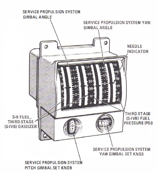 The gauges that are used to measure Saturn launch vehicle fuel and oxidizer pressures can be turned into Service Propulsion System engine nozzle angle gauges with the flick of a switch.