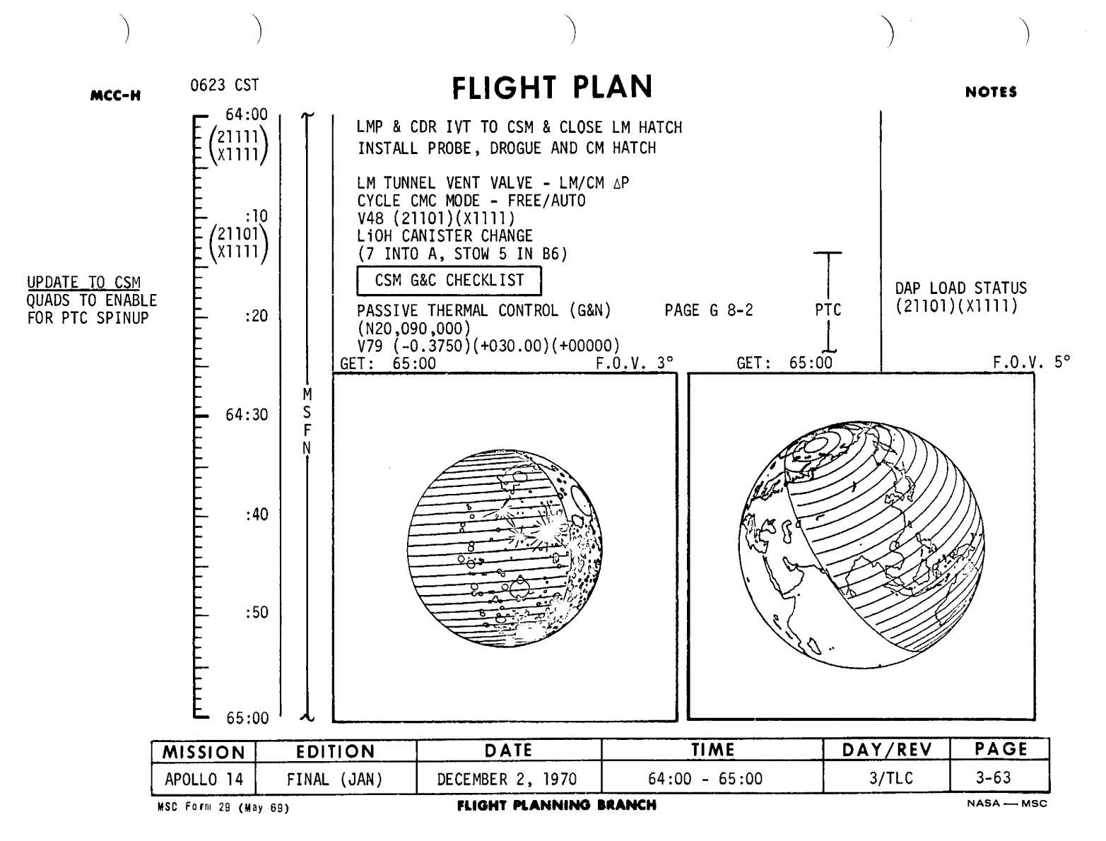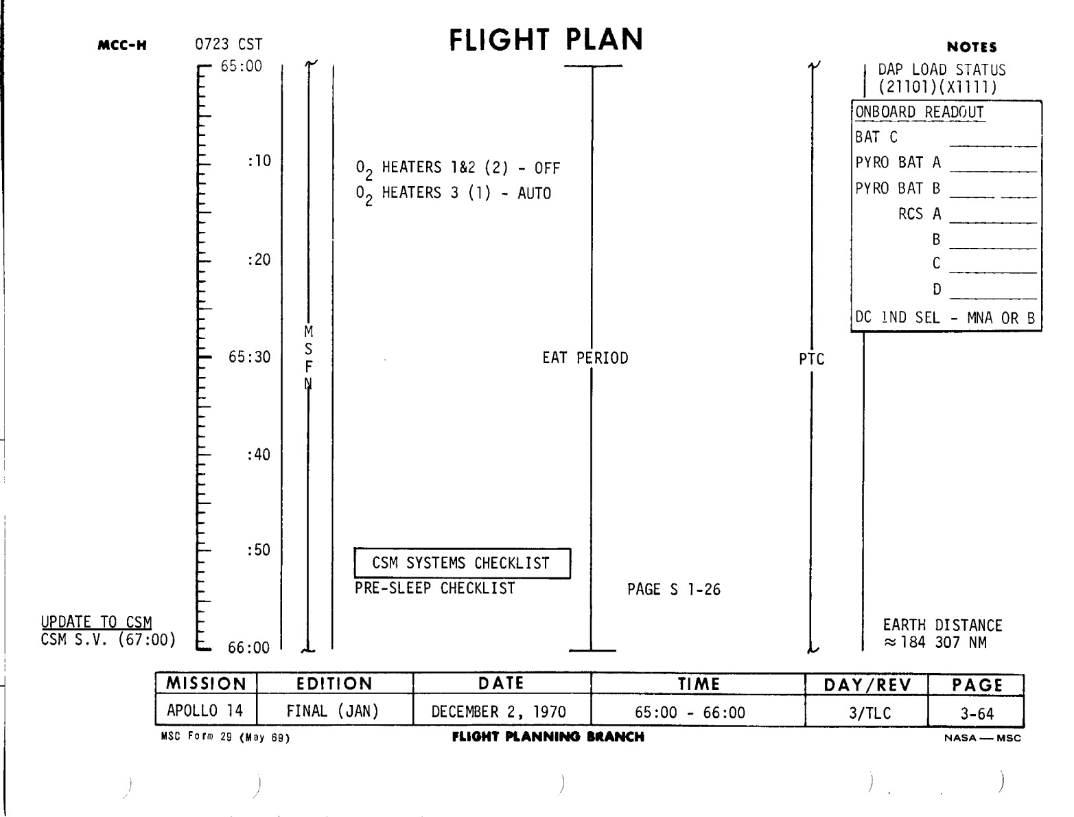 This is Apollo Control, Houston, at 68 hours 04 minutes into the flight - Ground Elapsed Time. We presently show Apollo 14 at a distance of 31,392 nautical miles [58,138 km] away from the Moon and traveling at a speed of 3321 feet per second [1,012 m/s] relative to the Moon. We've had no further conversation with the crew of Apollo 14 since they were awakened by CapCom Gordon Fullerton to check a high O2 flow rate. Presumably the crew, if not yet sleeping, shortly will be. We're at 68 hours, 05 minutes into the flight and this is Apollo Control, Houston.