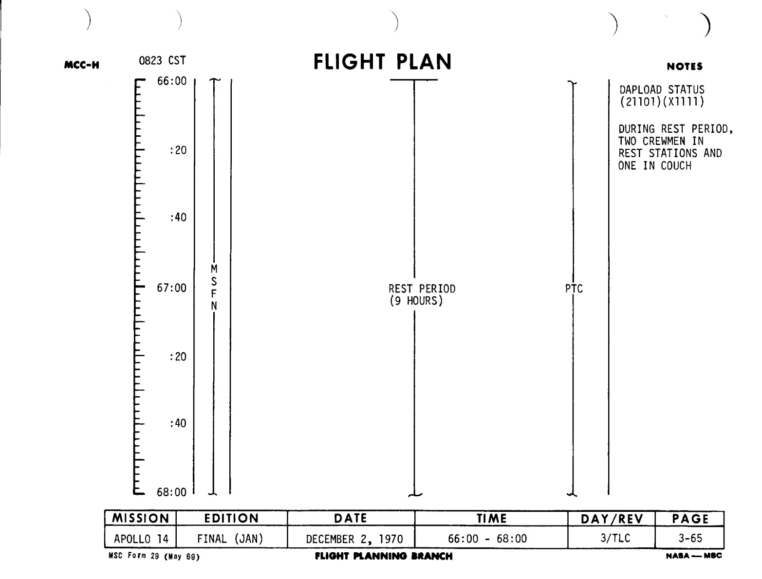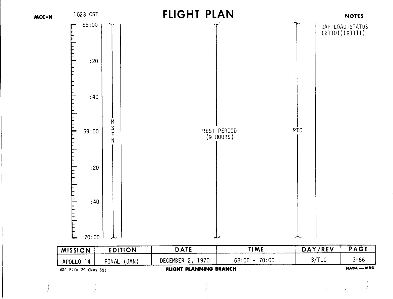 This is Apollo Control, Houston. At 68 hours, 33 minutes now into the flight of Apollo 14. We presently show Apollo 14 at a distance of 30,431 nautical miles [56,358 km] away from the Moon, now traveling at a velocity of 3,329 feet per second [1,015 m/s]. We've had no communications with the crew. Since our last report, the crew now in its rest period - they are in their rest period. Meanwhile, activity in Mission Control has been conversations over the flight directors loop have been quite subdued. It's been mainly a scene where flight controllers are studying their displays, they are considering the activities that will lie ahead on the next shift. A test of one of the lunar modular batteries by spacecraft Commander, Al Shepard, and Ed Mitchell is being considered either at the time of