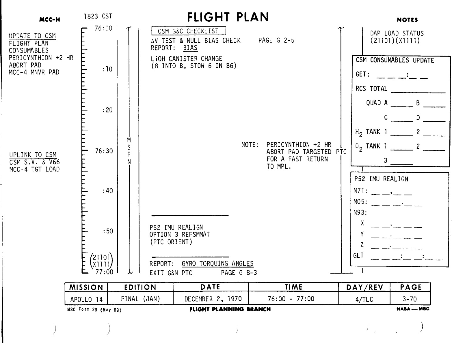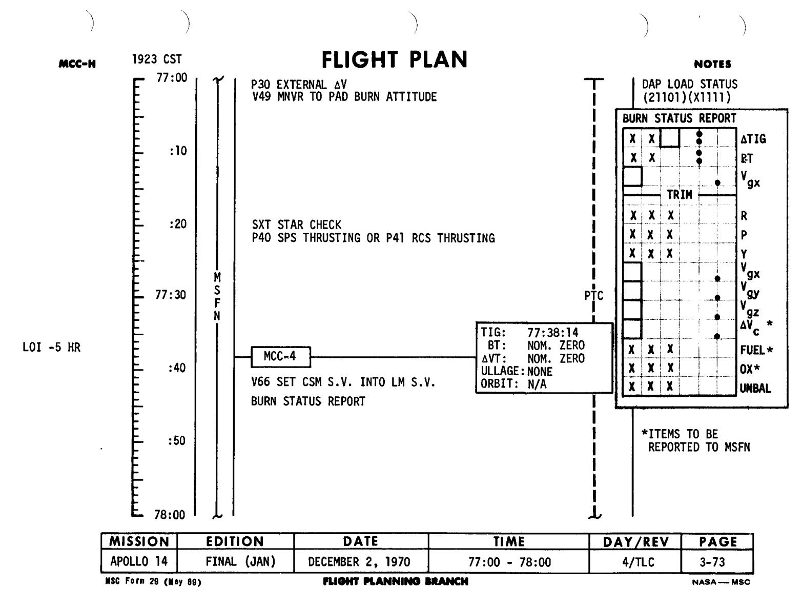 077:09:33 Roosa: Okay, Bruce. Looking over the Flight Plan, we moved up that maneuver to the Moon-view attitude, and I'm going to go the way I did back here right after midcourse 4 instead of where it shows over at 78:50 if you all agree.